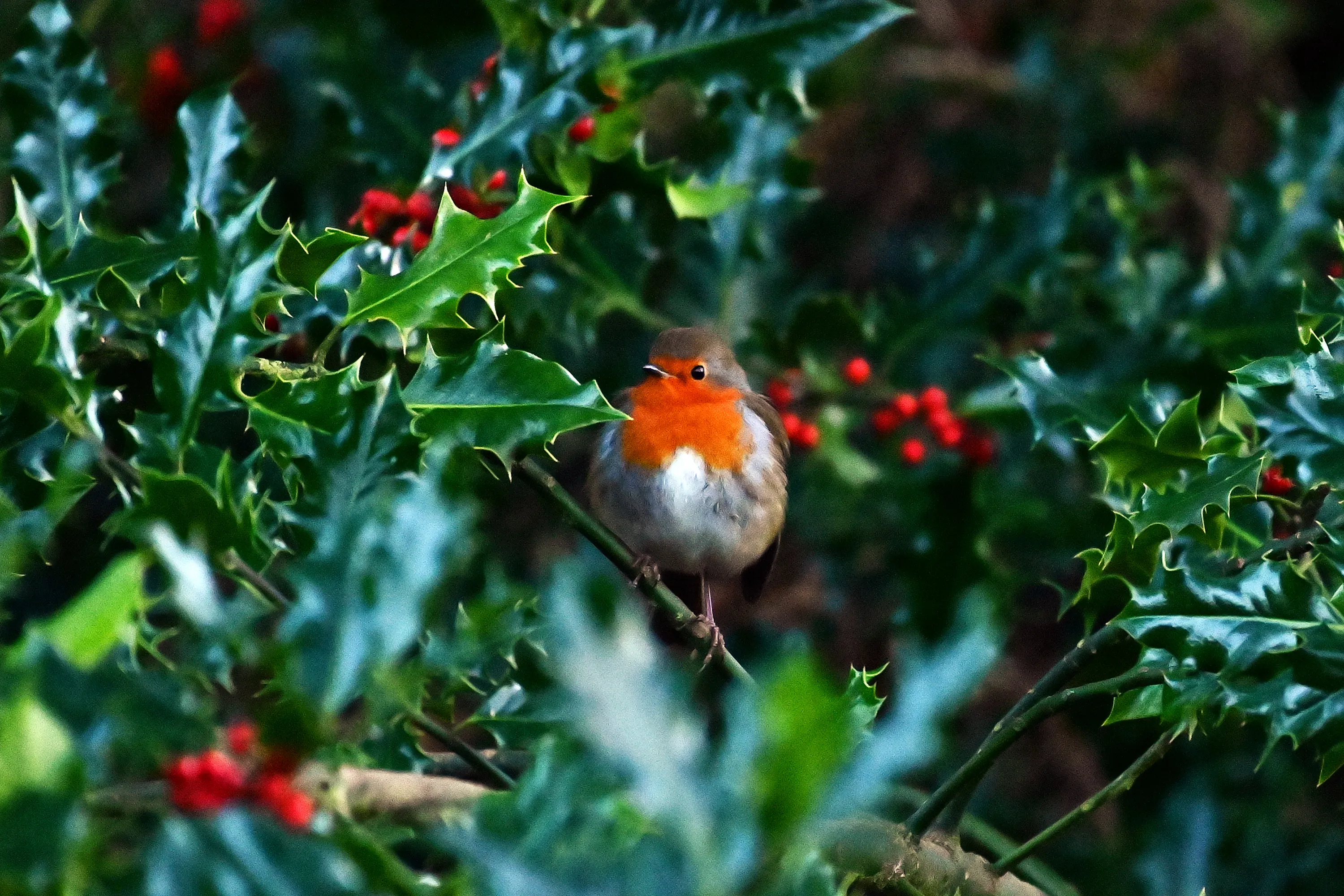 A robin sits on a holly branch at the RSPB's Loch Leven nature reserve, on December 2, 2020 in Kinross, Scotland. (Photo by Ken Jack/Getty Images)