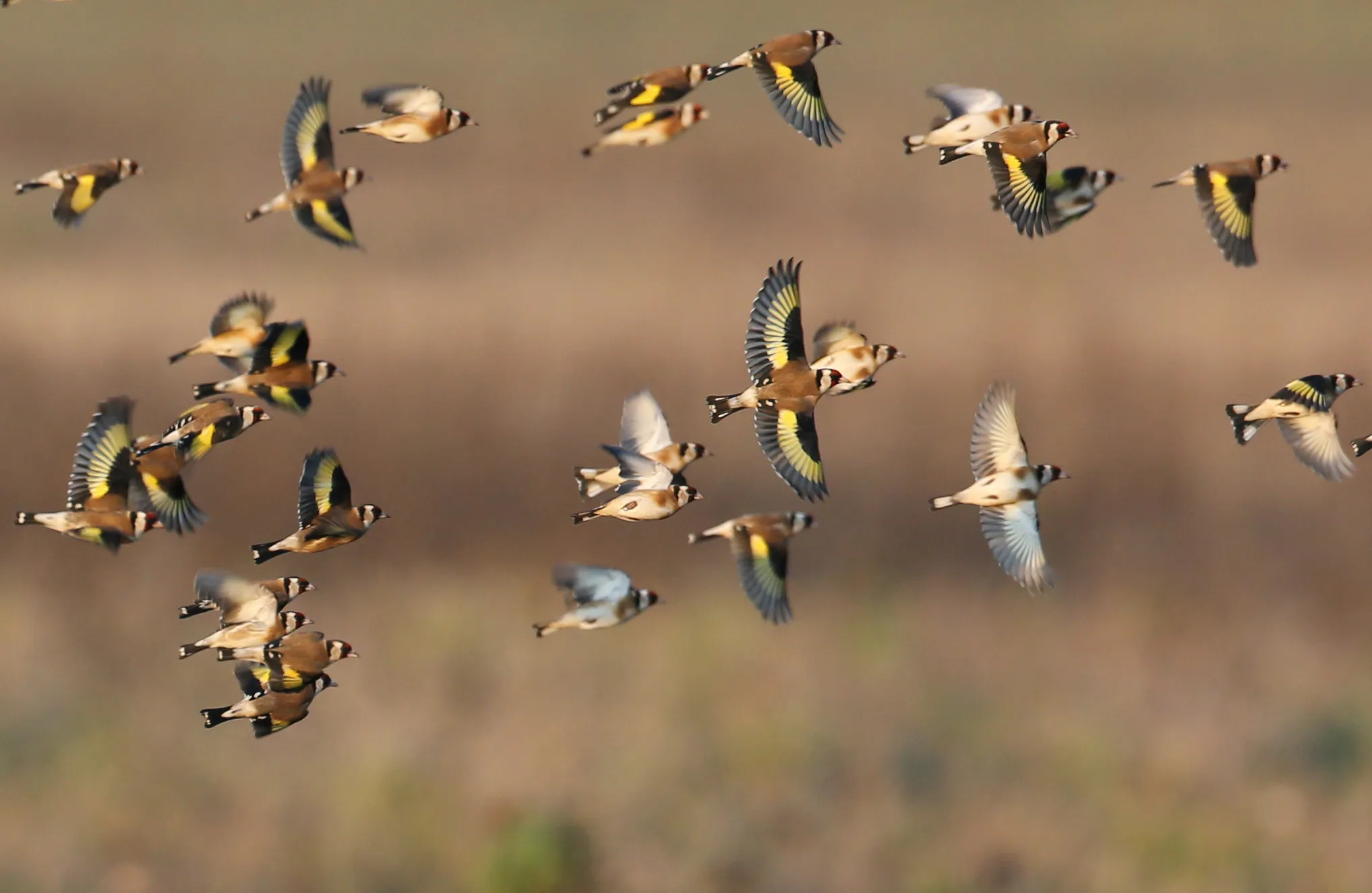 Goldfinches fly over a field of sunflowers and bushes in northern Saxony on December 2, 2020. The birds of the finch family spend the winter in large groups and roam around in search of food. (Photo by Sebastian Willnow/dpa)