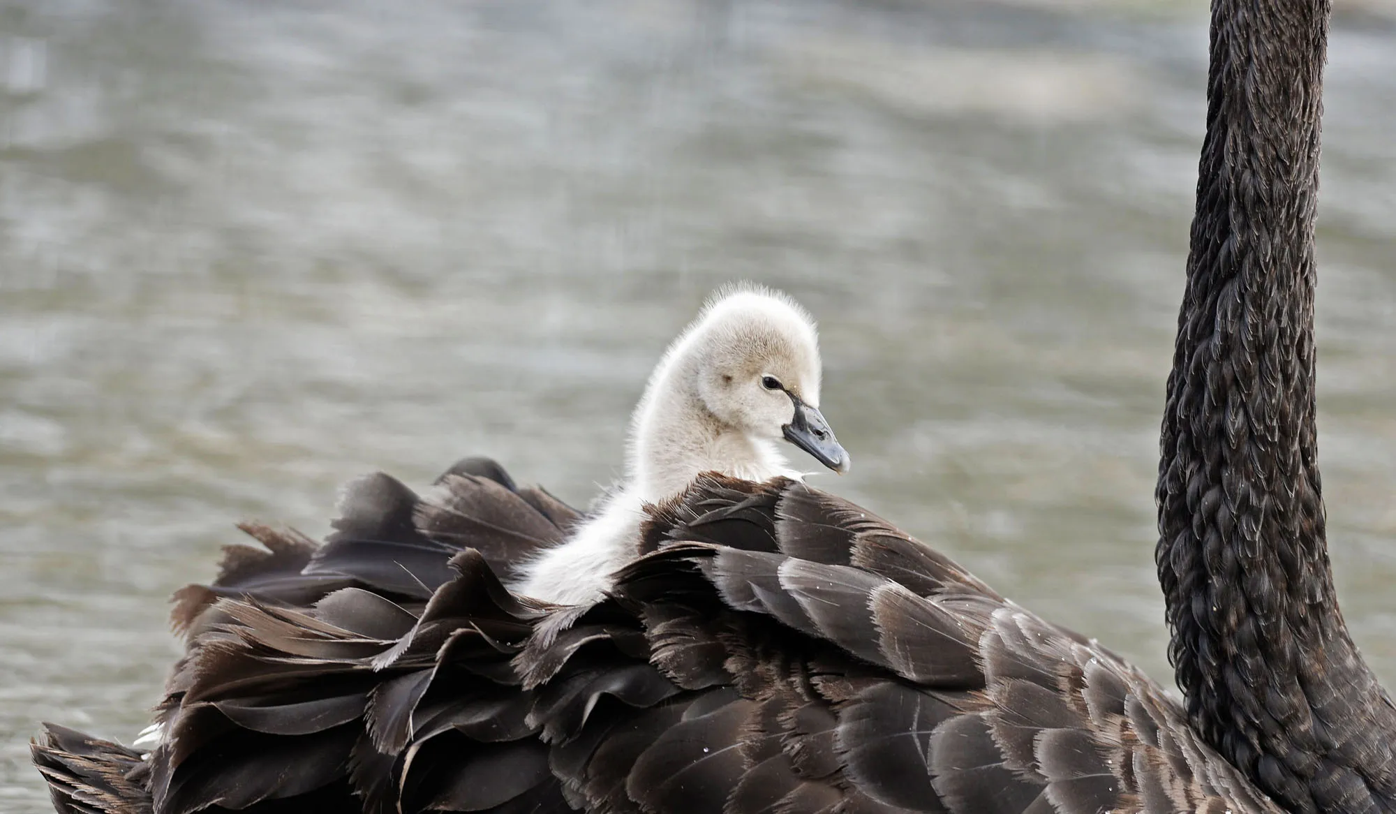 A newborn cygnet hides under its mother's wing to keep warm at honghe Wetland scenic spot in Tengzhou City, East China's Shandong Province, November 22, 2020. (Photo by Costfoto/Barcroft Media via Getty Images)