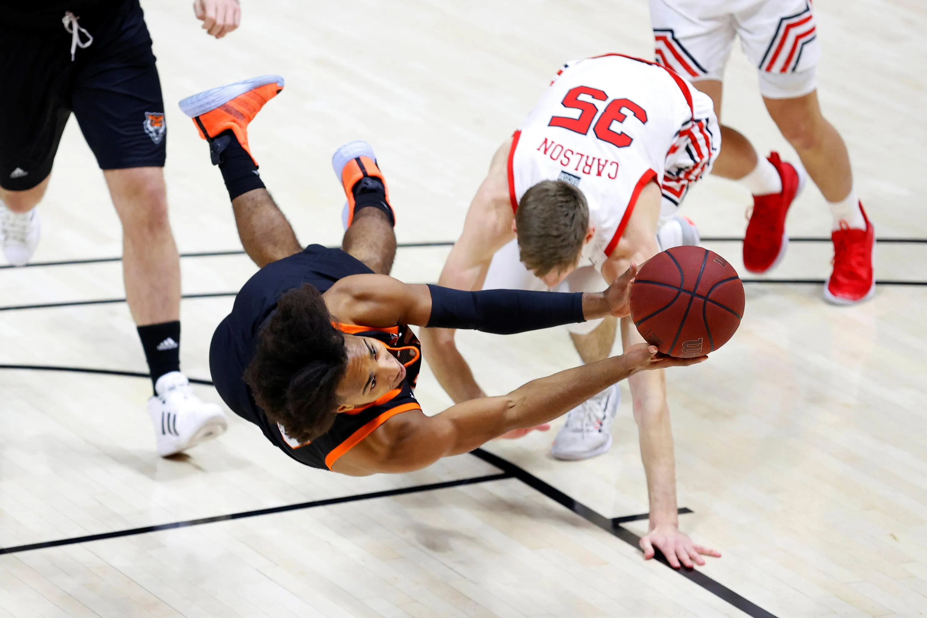 Idaho State guard Robert Ford III, foreground, tries to get a shot off against Utah Utes center Branden Carlson (35)during the first half of an NCAA college basketball game Tuesday, December 8, 2020, in Salt Lake City. (Photo by Jeffrey Swinger/USA TODAY Sports)