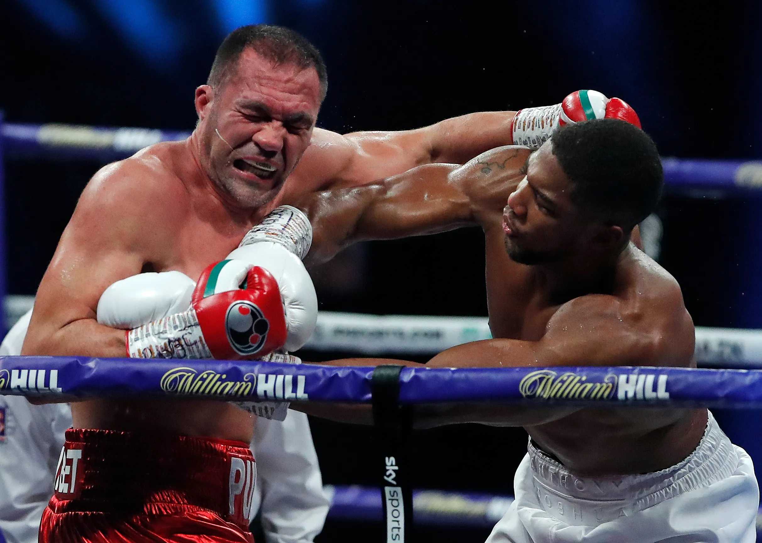 Anthony Joshua punches Kubrat Pulev during the IBF, WBA, WBO and IBO World Heayweight Title fight between Anthony Joshua and Kubrat Pulev at The SSE Arena, Wembley on December 12, 2020 in London, England. A limited number of fans (1000) are welcomed back to sporting venues to watch elite sport across England. This was following easing of restrictions on spectators in tiers one and two areas only. (Photo by Andrew Couldridge – Pool/Getty Images)