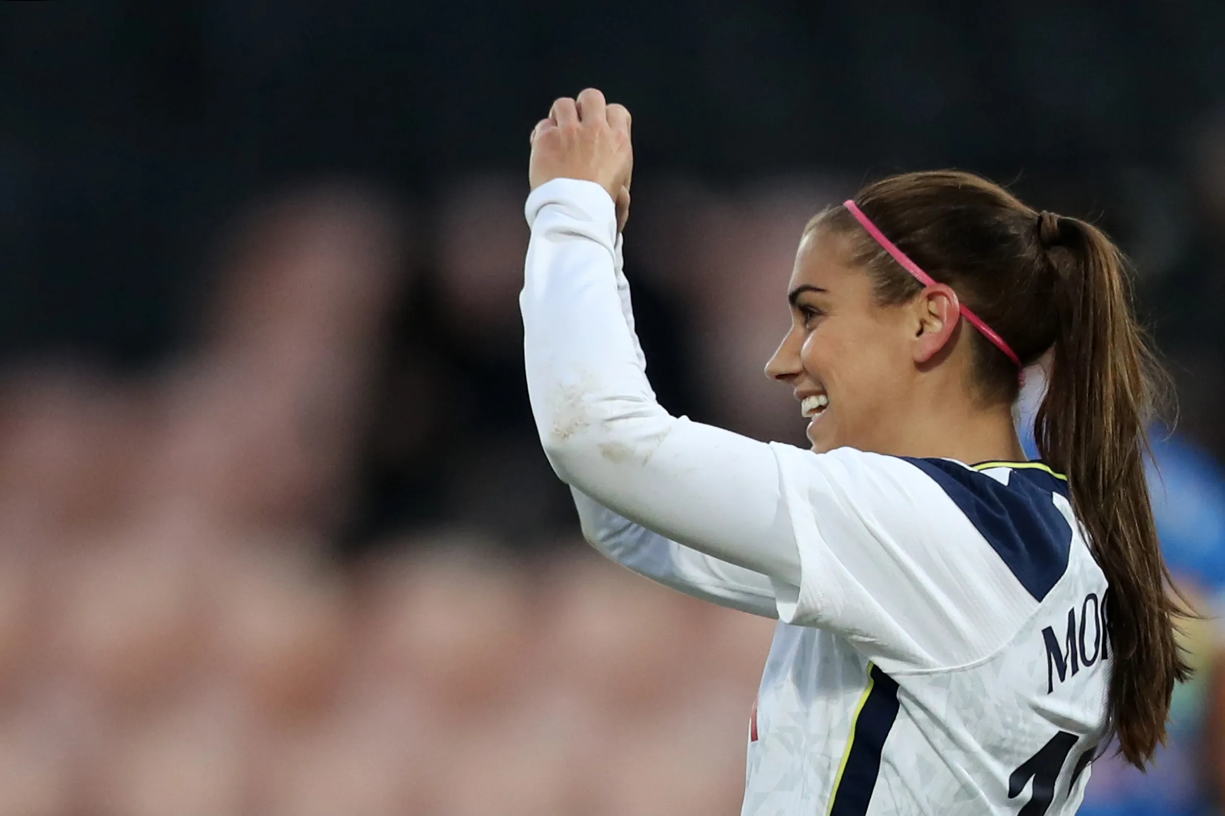 Alex Morgan of Tottenham Hotspur celebrates after scoring their team's third goal and makes a heart shape with her hands towards her Daughter and Husband in the stands watching the match during the Barclays FA Women's Super League match between Tottenham Hotspur Women and Brighton & Hove Albion Women at The Hive on December 06, 2020 in Barnet, England. A limited number of fans are welcomed back to stadiums to watch elite football across England. This was following easing of restrictions on spectators in tiers one and two areas only. (Photo by Naomi Baker/Getty Images)