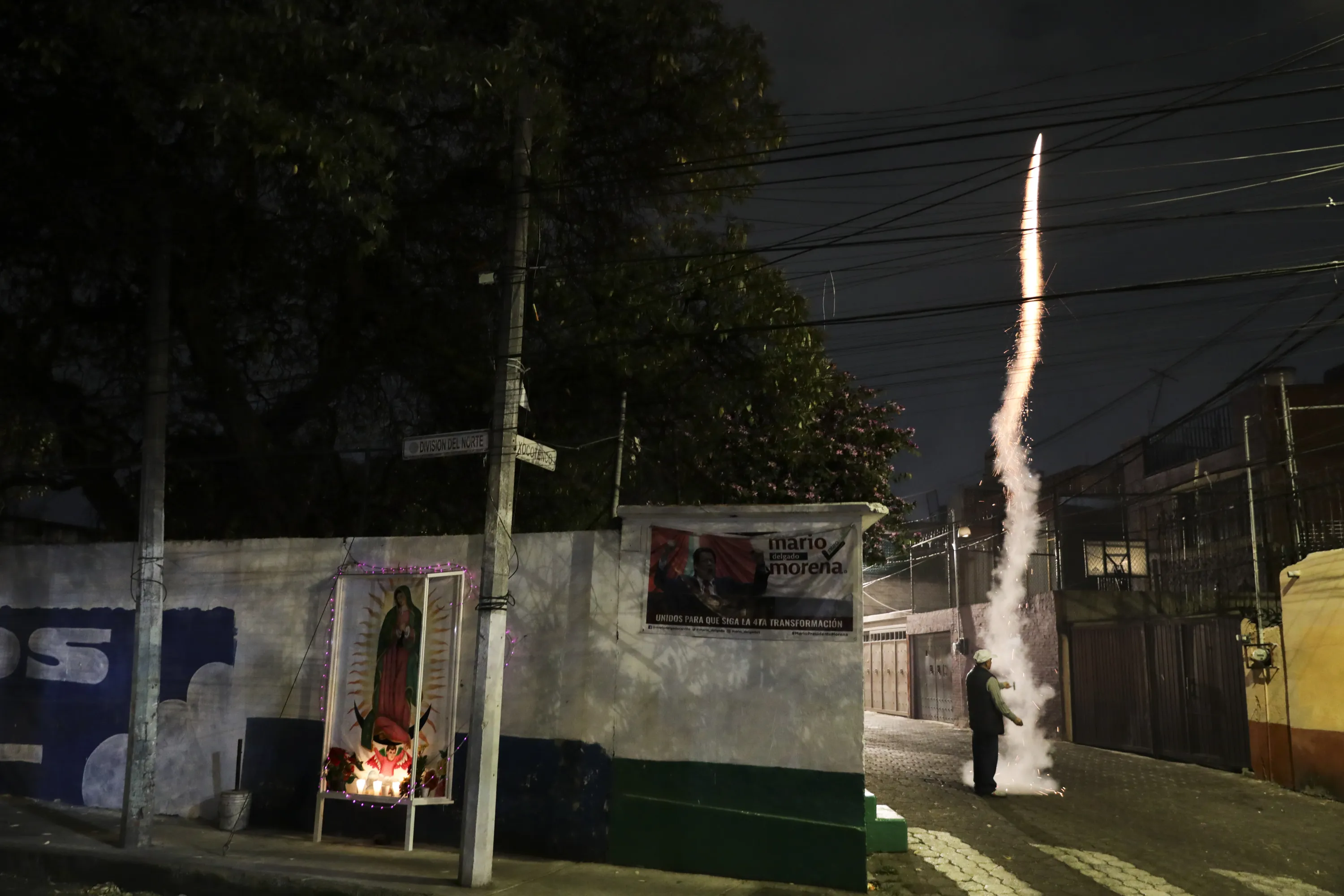 A man lights a firecracker next to a decorated shrine to the Virgin of Guadalupe in Mexico City, Friday December 11, 2020. Nationwide, devotees of the Virgin make a pilgrimage to the Basilica in honor of her December 12 feast day, but the Catholic Church announced the closure of the Basilica for this year's pilgrimage due to the coronavirus pandemic. (Photo by Eduardo Verdugo/AP Photo)