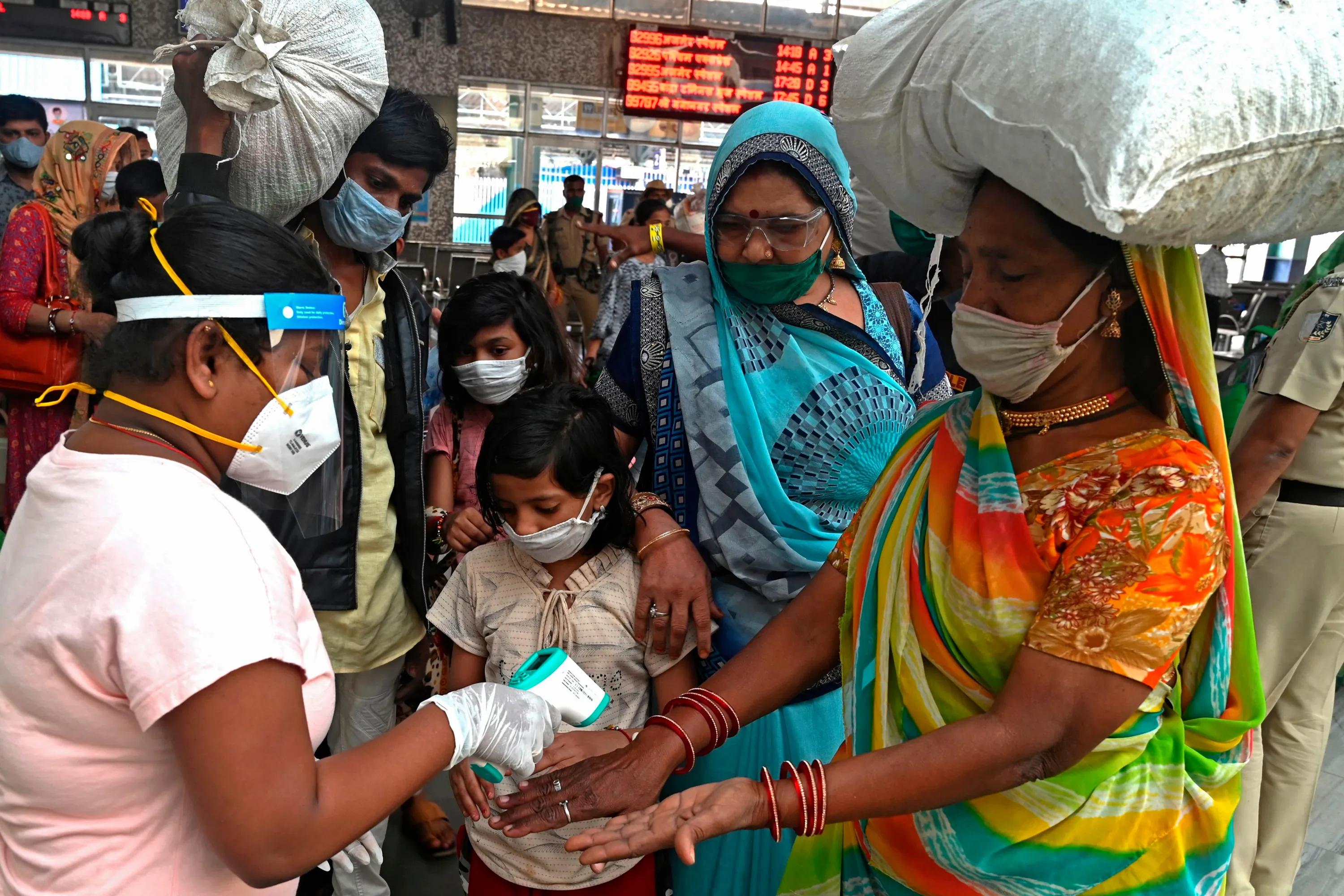 A health worker checks the body temperature of train passengers upon their arrival during the mandatory Covid-19 coronavirus screening at a railway terminus in Mumbai on December 9, 2020. (Photo by Indranil Mukherjee/AFP Photo)
