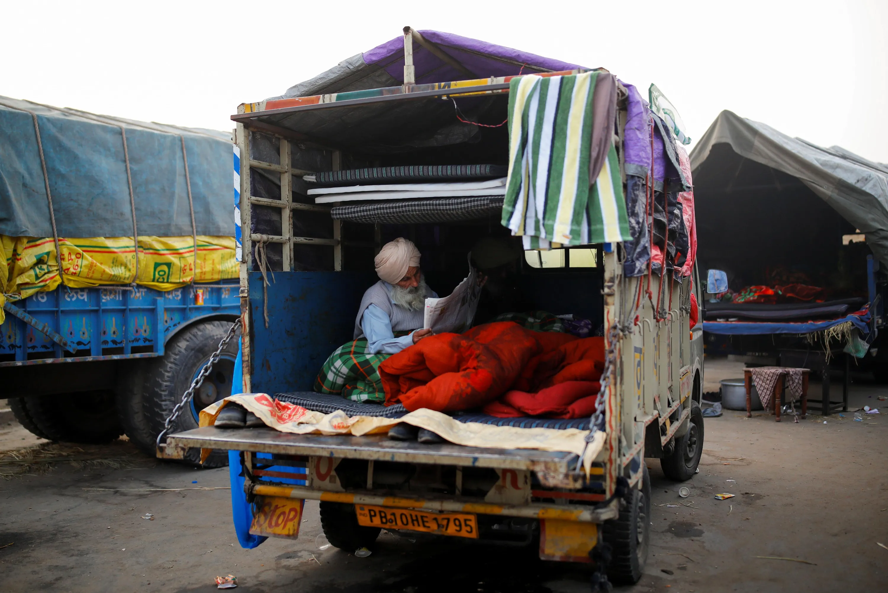 A farmer sits inside a vehicle as he reads a newspaper at the site of a protest against the newly passed farm bills at Singhu border in Delhi, India, December 6, 2020. (Photo by Adnan Abidi/Reuters)