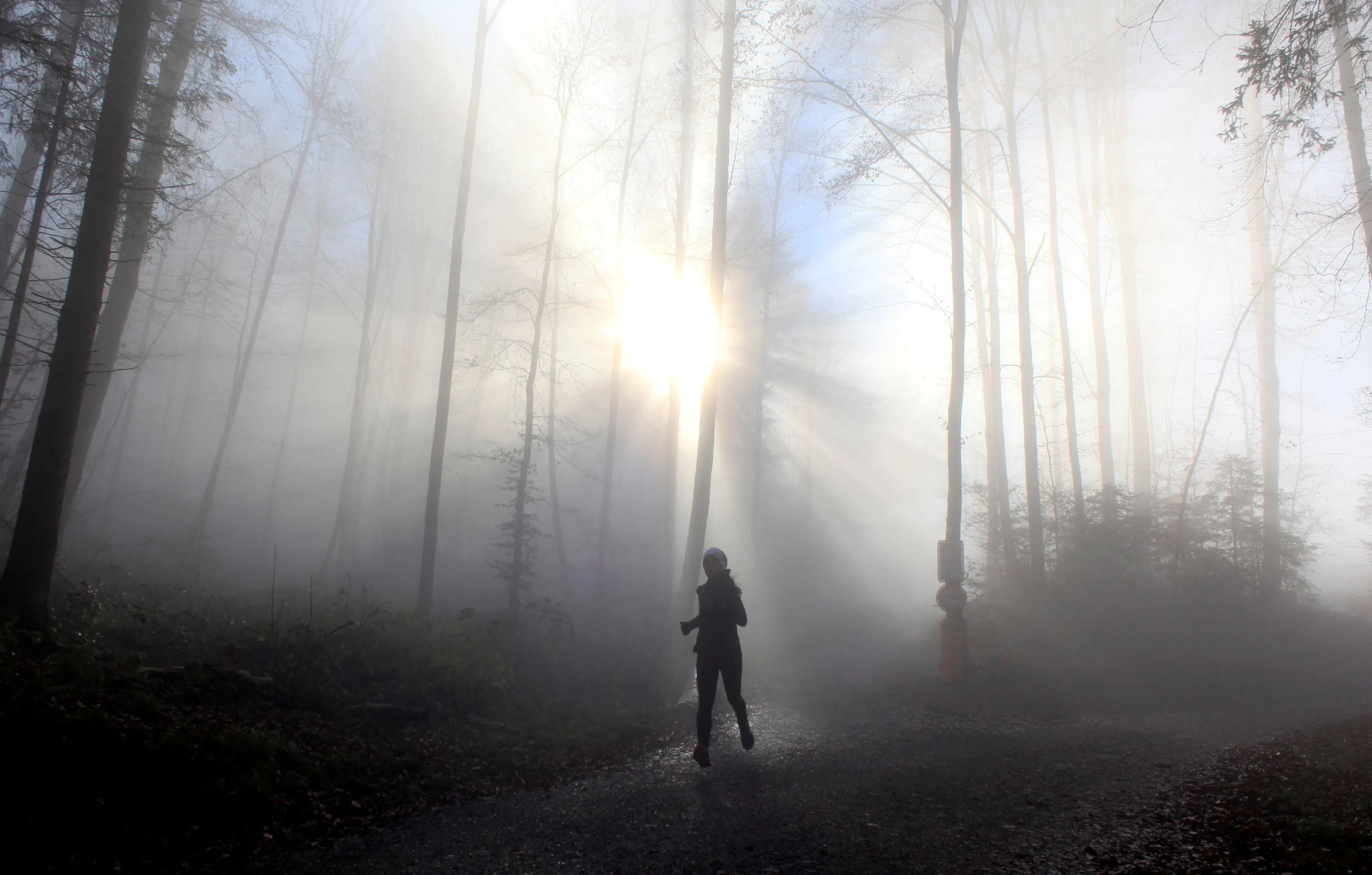 A woman joggs during foggy weather in a forest, in Zurich, Switzerland on November 26, 2020. (Photo by Arnd Wiegmann/Reuters)