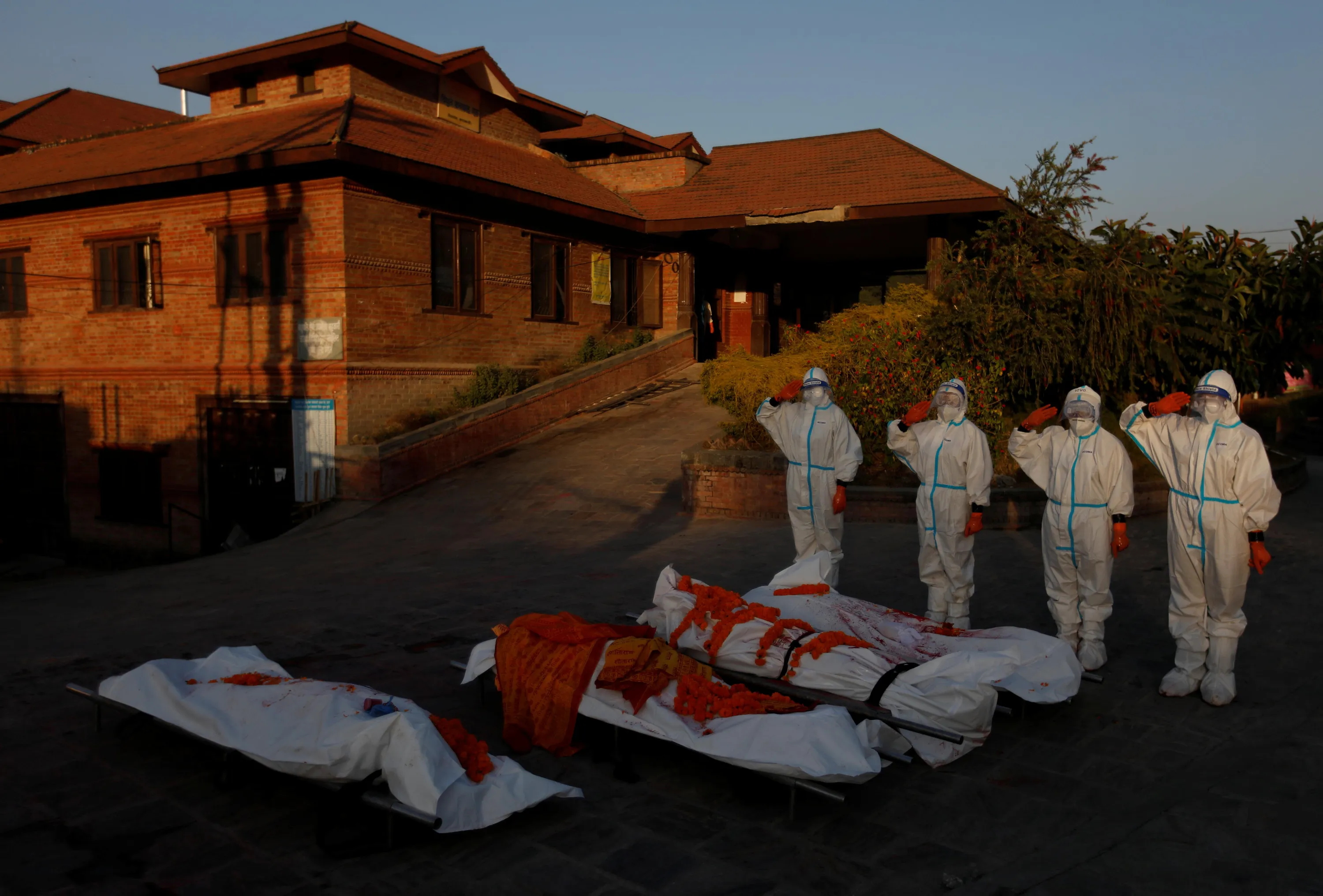 Female soldiers pay tribute to the bodies of coronavirus victims at a crematorium in Kathmandu, Nepal, November 11, 2020. “I feel privileged and happy for being given a chance to do the work that was done only by the males so far”, said one of the women, a 25-year-old corporal named Rachana, who asked to be identified by just one name. “Society is changing ... I have not been to my family since I started my new duty, but my friends are happy. They thank me and say, 'You have performed a difficult task carefully and maintained your personal safety. Thank you'. I feel happy”. (Photo by Navesh Chitrakar/Reuters)
