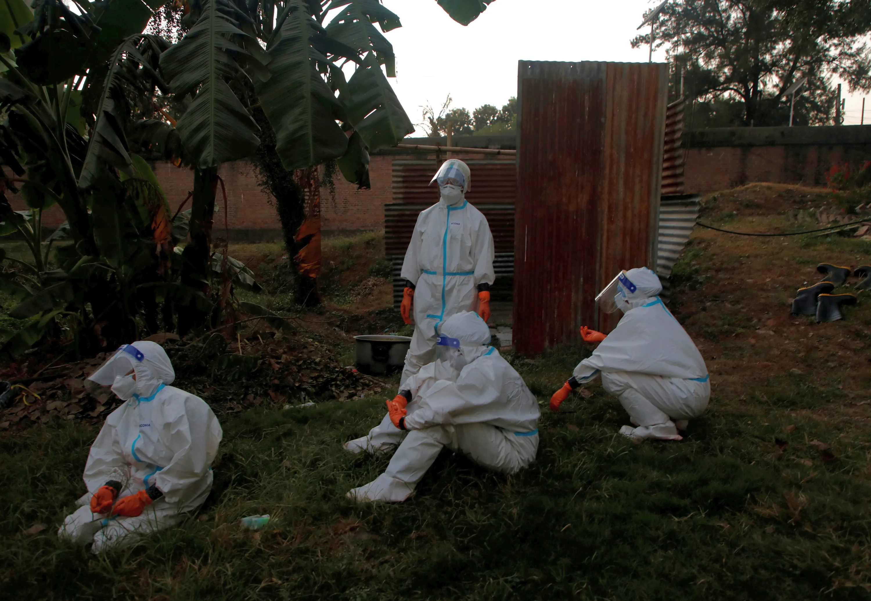 Female soldiers wearing personal protective equipment (PPE) take rest after handling bodies of coronavirus victims, amidst the spread of the coronavirus disease (COVID-19), in Kathmandu, Nepal on November 11, 2020. (Photo by Navesh Chitrakar/Reuters)