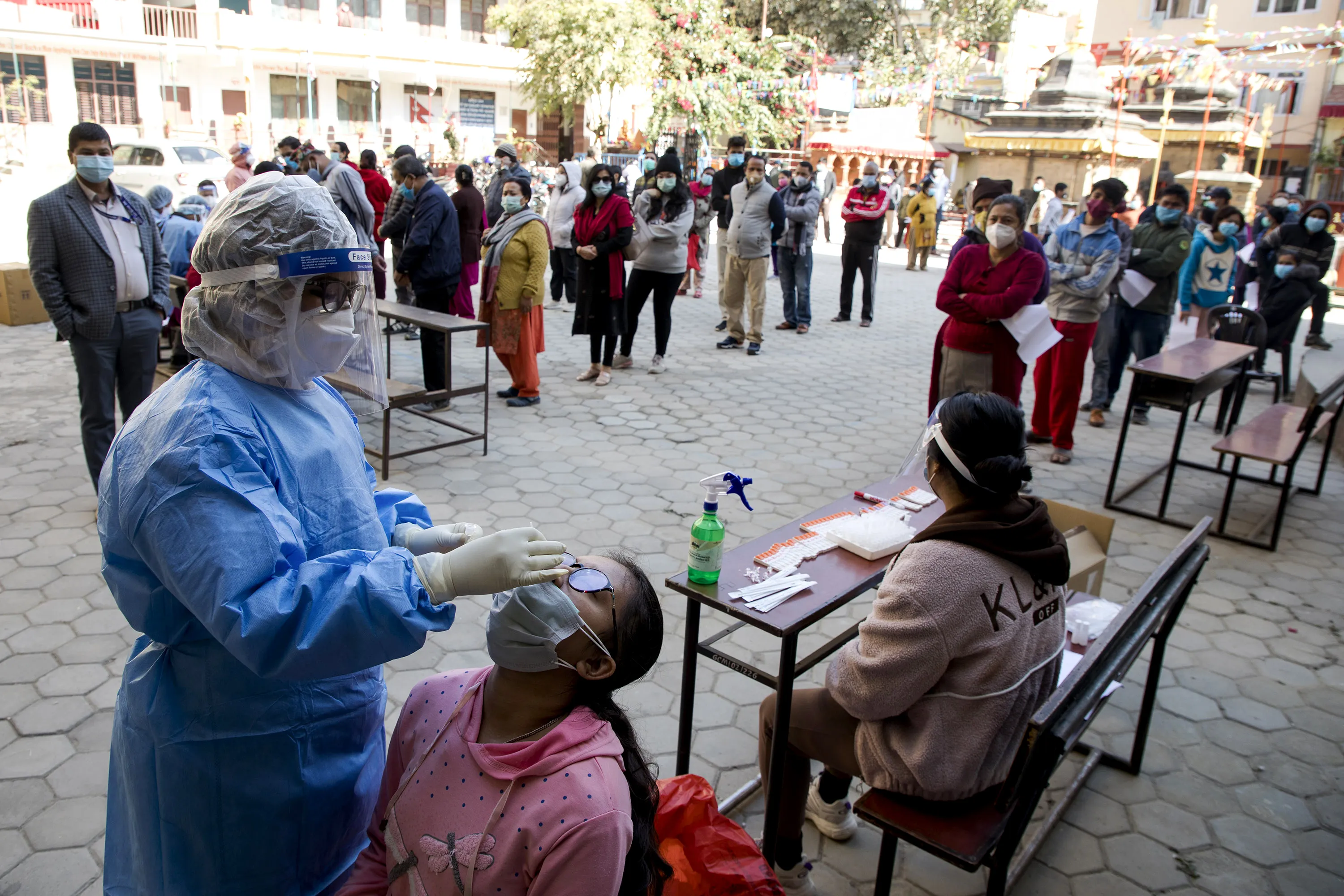 A Ministry of Health staff collects a nose swab sample for an antigen test amid the ongoing coronavirus COVID-19 pandemic at Kathmandu, Nepal, 02 December 2020. According to local media the test is newly launched at the government level to detect COVID-19 infection in the community. Results will be available within 30 minutes which makes this test much more easier. (Photo by Hemanta Shrestha/EPA/EFE/Rex Features/Shutterstock)