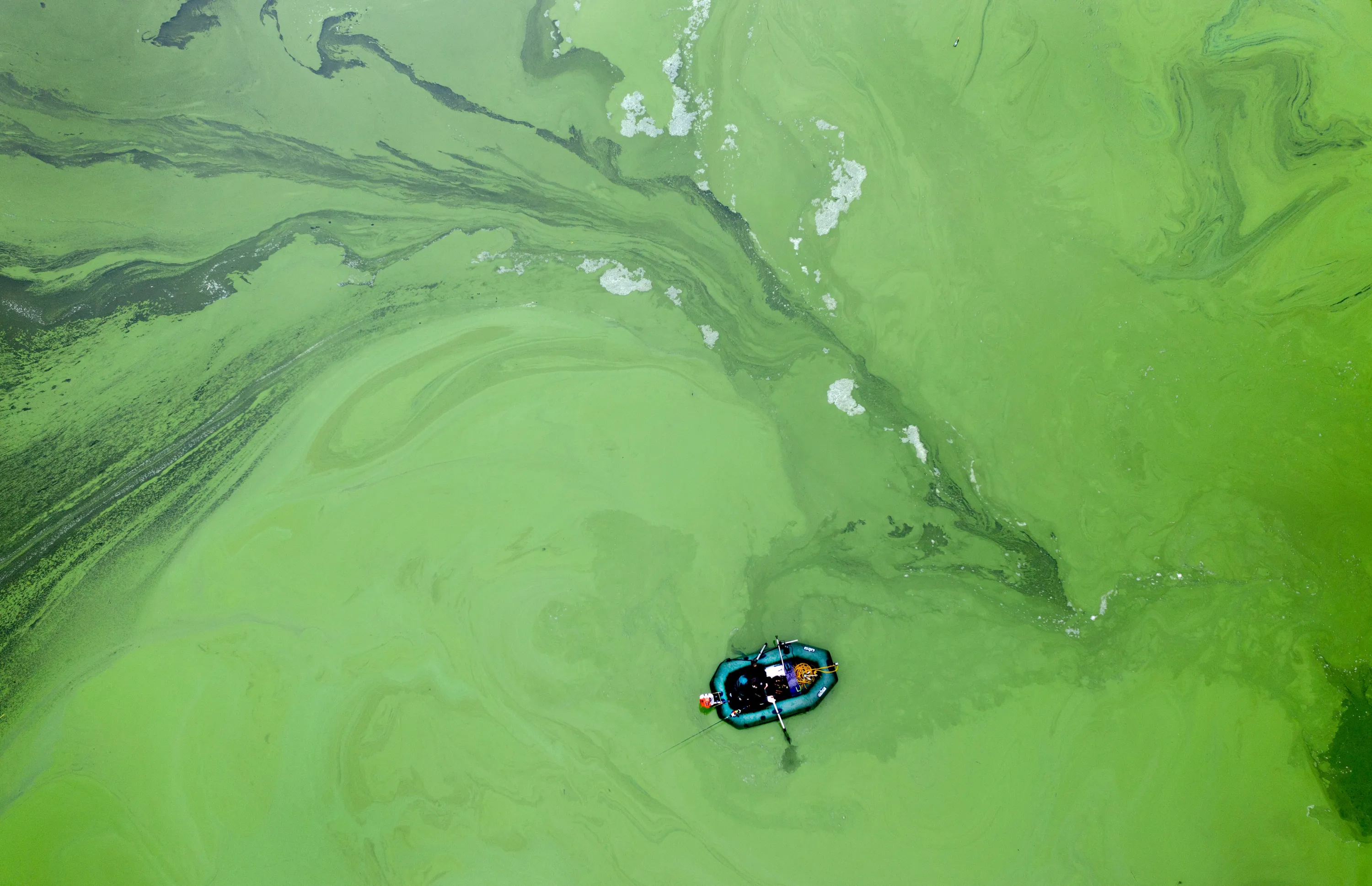 A fisherman in a rubber boat is surrounded by rotting cyanobacteria in the Kyiv Water Reservoir near Kyiv, Ukraine, Sunday, November 15, 2020. The region was rocked by extreme hot weather throughout 2020 that resulted in widespread damage to agricultural crops and destruction to the natural habitat of some species. (Photo by Efrem Lukatsky/AP Photo)
