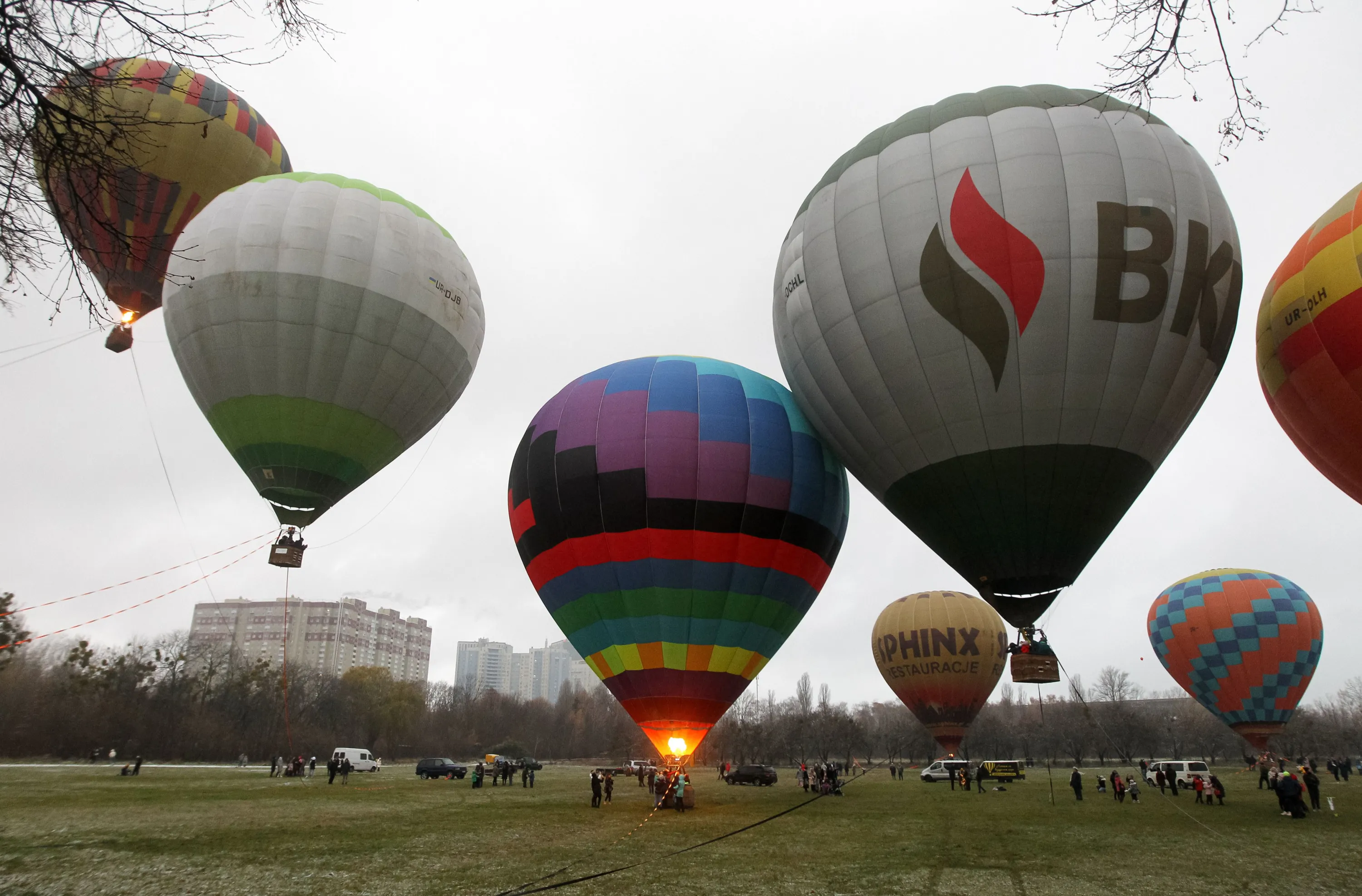 People fly on hot air balloons during a festival in Kyiv, Ukraine on 02 December 2020. The festival of hot air balloons “Montgolfieria”, which timed to the anniversary of the launch of the first balloon in history by the Montgolfier brothers, takes place in the Ukrainian capital. By purchasing the appropriate ticket, the festival visitors have the opportunity to make a short flight in a hot air balloon and take a picture. (Photo by NurPhoto via Getty Images)