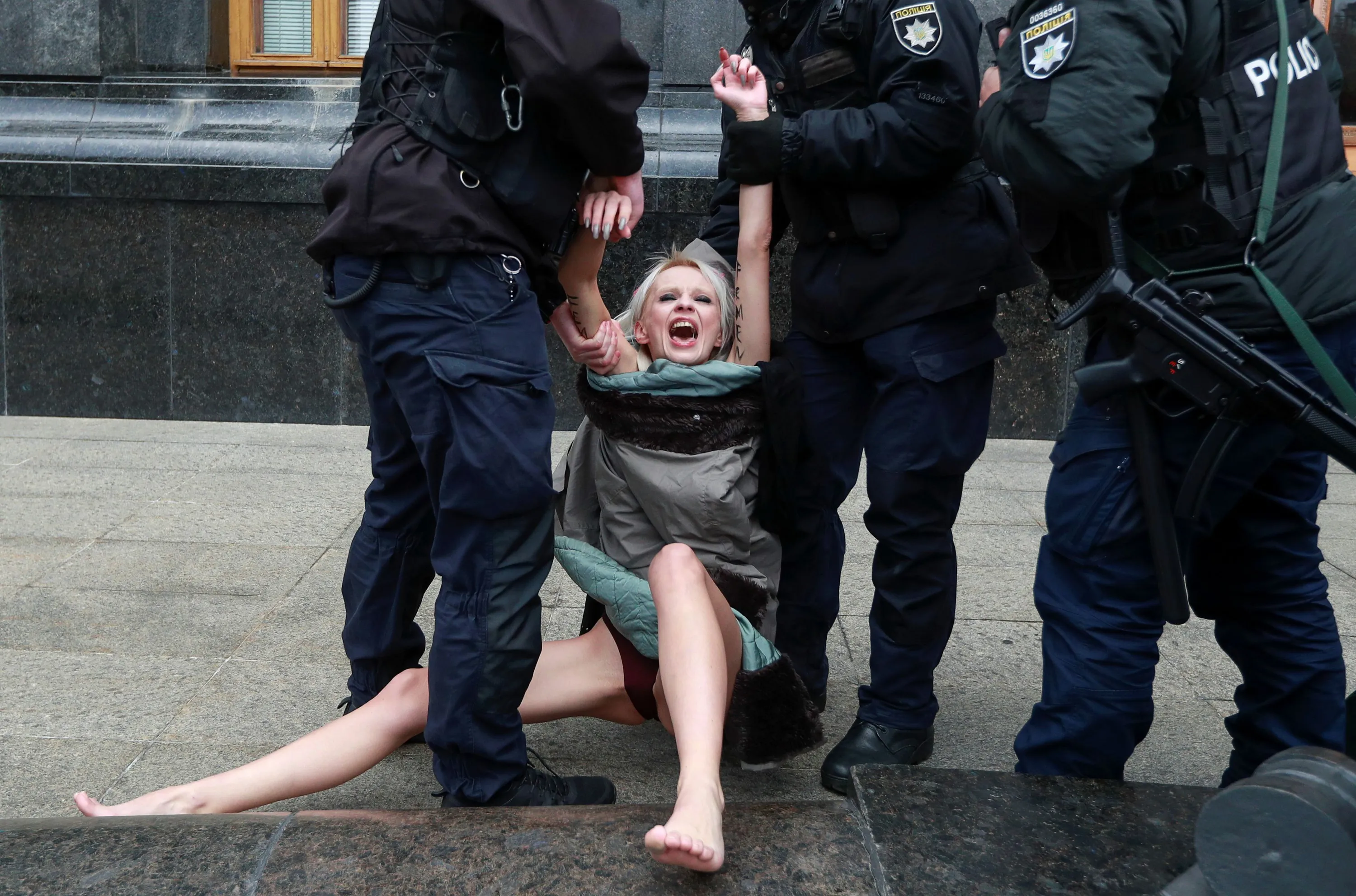 Ukrainian law enforcement officers restrain an activist of women's rights group Femen, who holds a protest outside the presidential administration headquarters while marking the International Day for the Elimination of Violence against Women in Kyiv, Ukraine on November 25, 2020. (Photo by Valentyn Ogirenko/Reuters)
