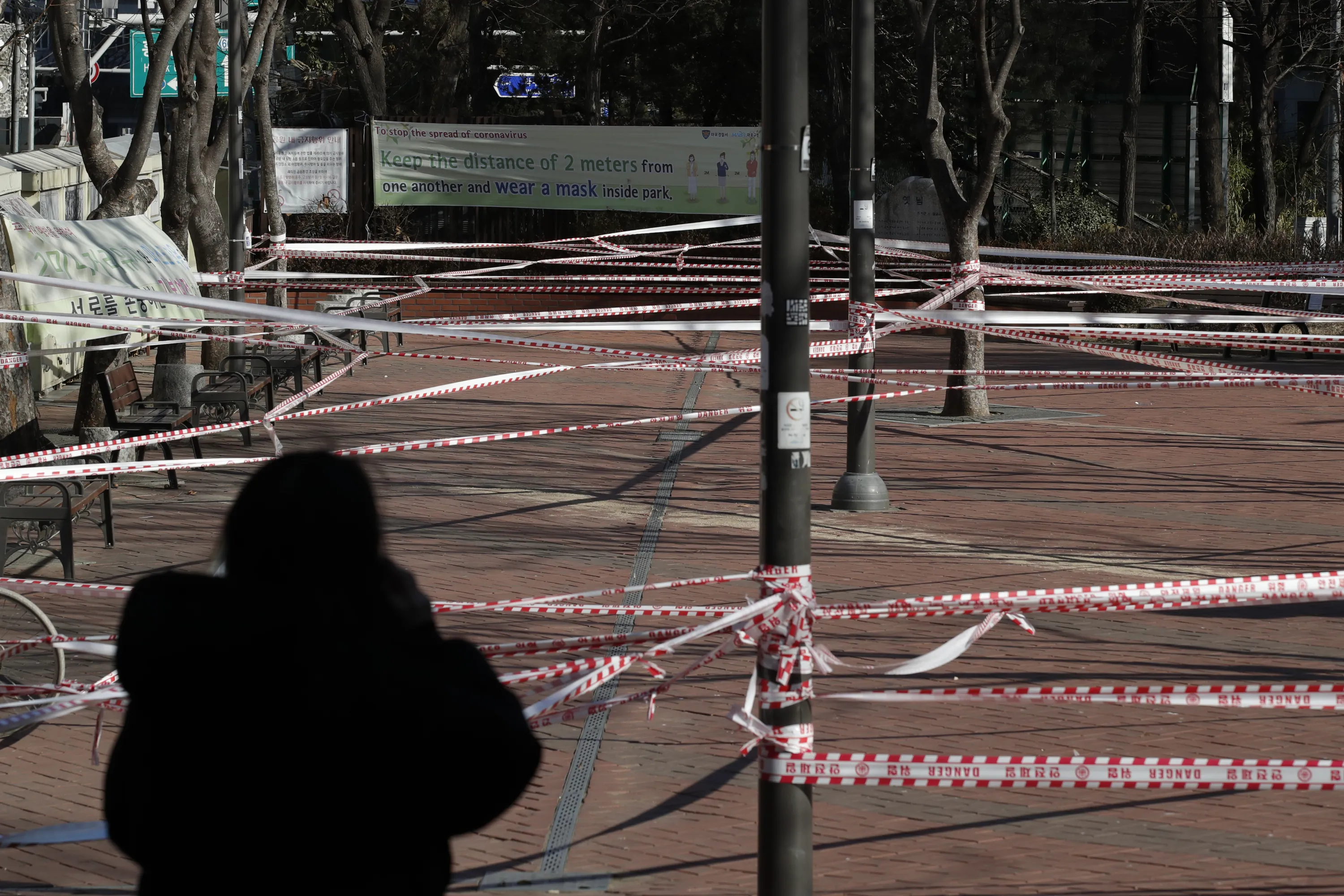 A park is taped off for the social distancing measures and a precaution against the coronavirus in Seoul, South Korea, Wednesday, December 16, 2020. (Photo by Lee Jin-man/AP Photo)