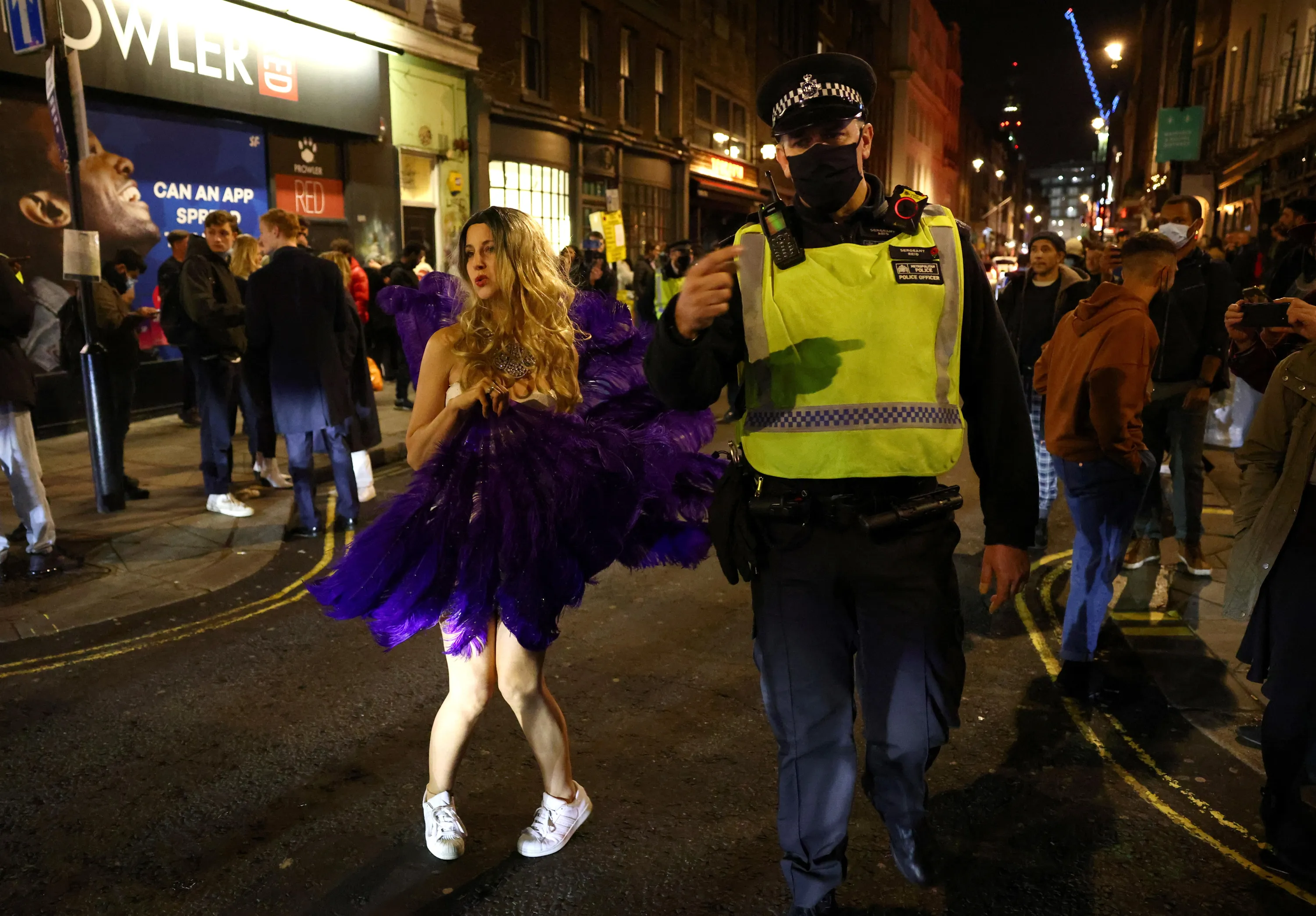 A police officer patrols as people party on a street as pubs shut for the night due to tier 3 restrictions in Soho, as the spread of the coronavirus disease (COVID-19) continues in London, Britain, December 15, 2020. (Photo by Henry Nicholls/Reuters)