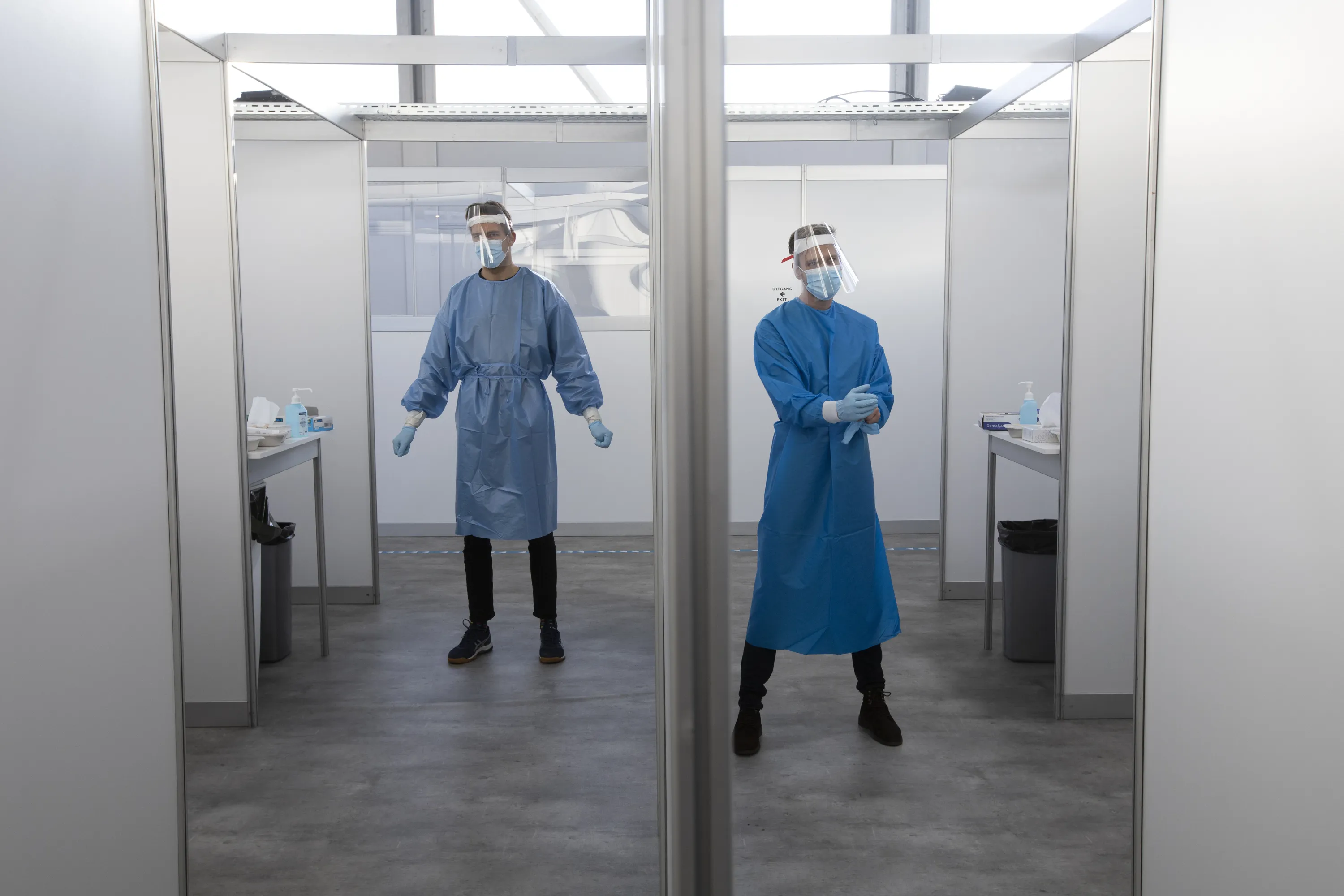 Medical staff wait for the next in line for a throat and nasal swab at a COVID-19 testing facility of the Municipal Health Authority GGD, in Utrecht, Netherlands, Wednesday, December 16, 2020. Dutch Prime Minister Mark Rutte imposed a tough lockdown Monday night in a speech to the nation ordering all non-essential shops and businesses such as hair salons, museums and theaters to close as coronavirus infection rates in the Netherlands rise sharply despite a two-month partial lockdown. (Photo by Peter Dejong/AP Photo)