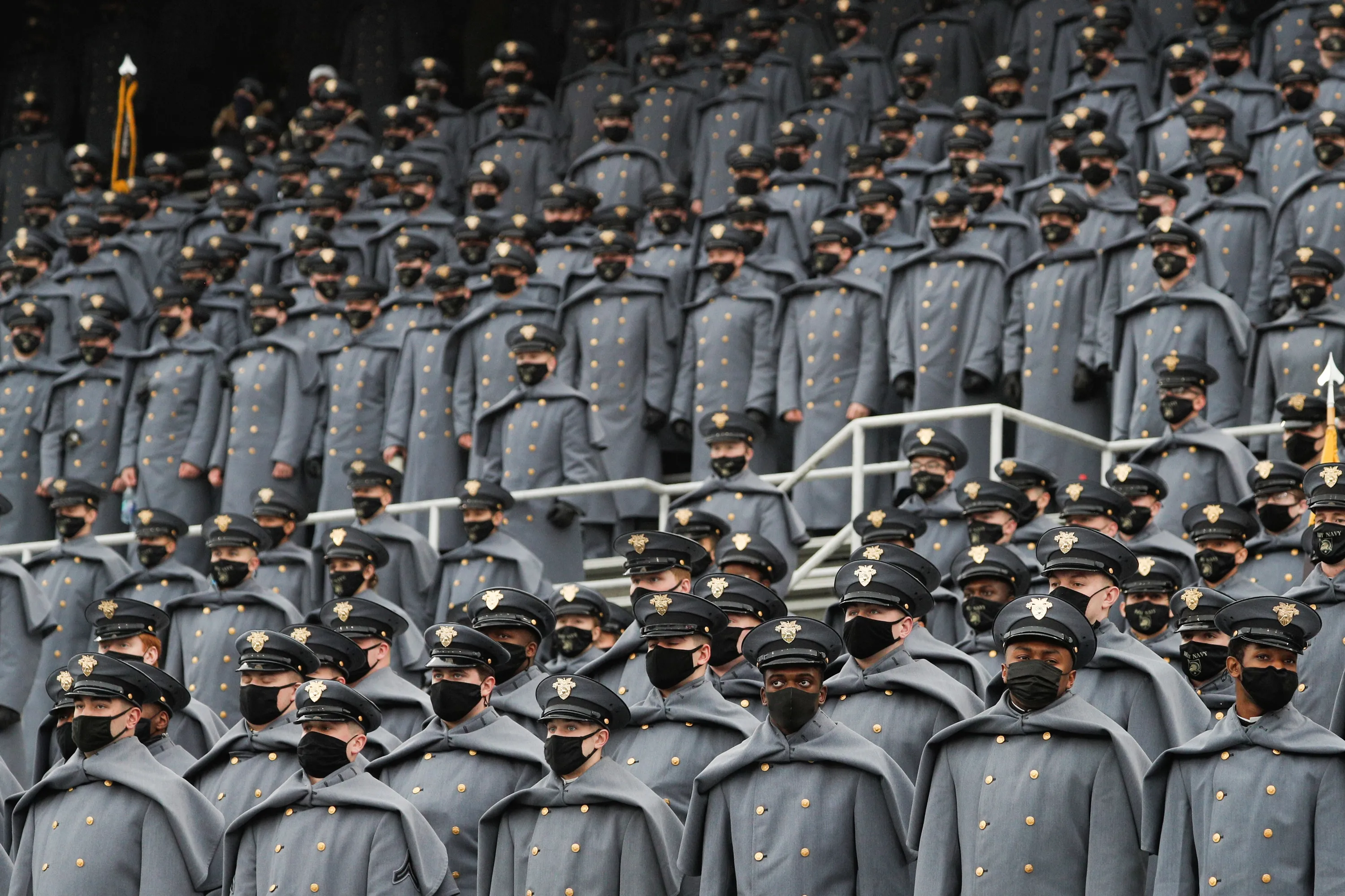 U.S. Army cadets wearing protective masks with the message "Beat Navy" stand at Michie Stadium ahead of the annual Army-Navy collegiate football game, in West Point, New York, U.S., December 12, 2020. (Photo by Tom Brenner/Reuters)