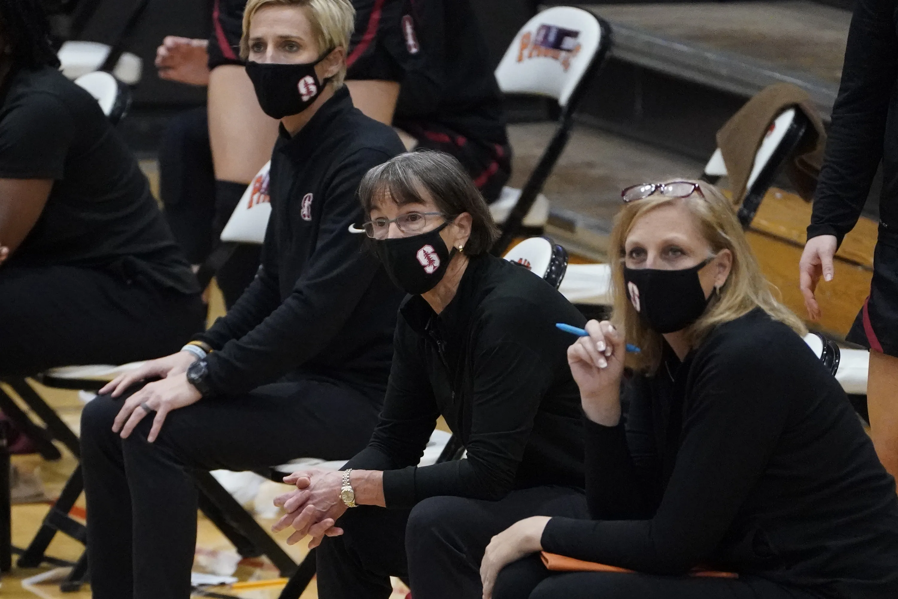 Stanford head coach Tara VanDerveer, center, watches the action against Pacific during the first half of an NCAA college basketball game in Stockton, Calif., Tuesday, December 15, 2020. With a win over Pacific, VanDerveer will become the winningest women's coach in history breaking Pat Summitt's record of 1,098. (Photo by Rich Pedroncelli/AP Photo)