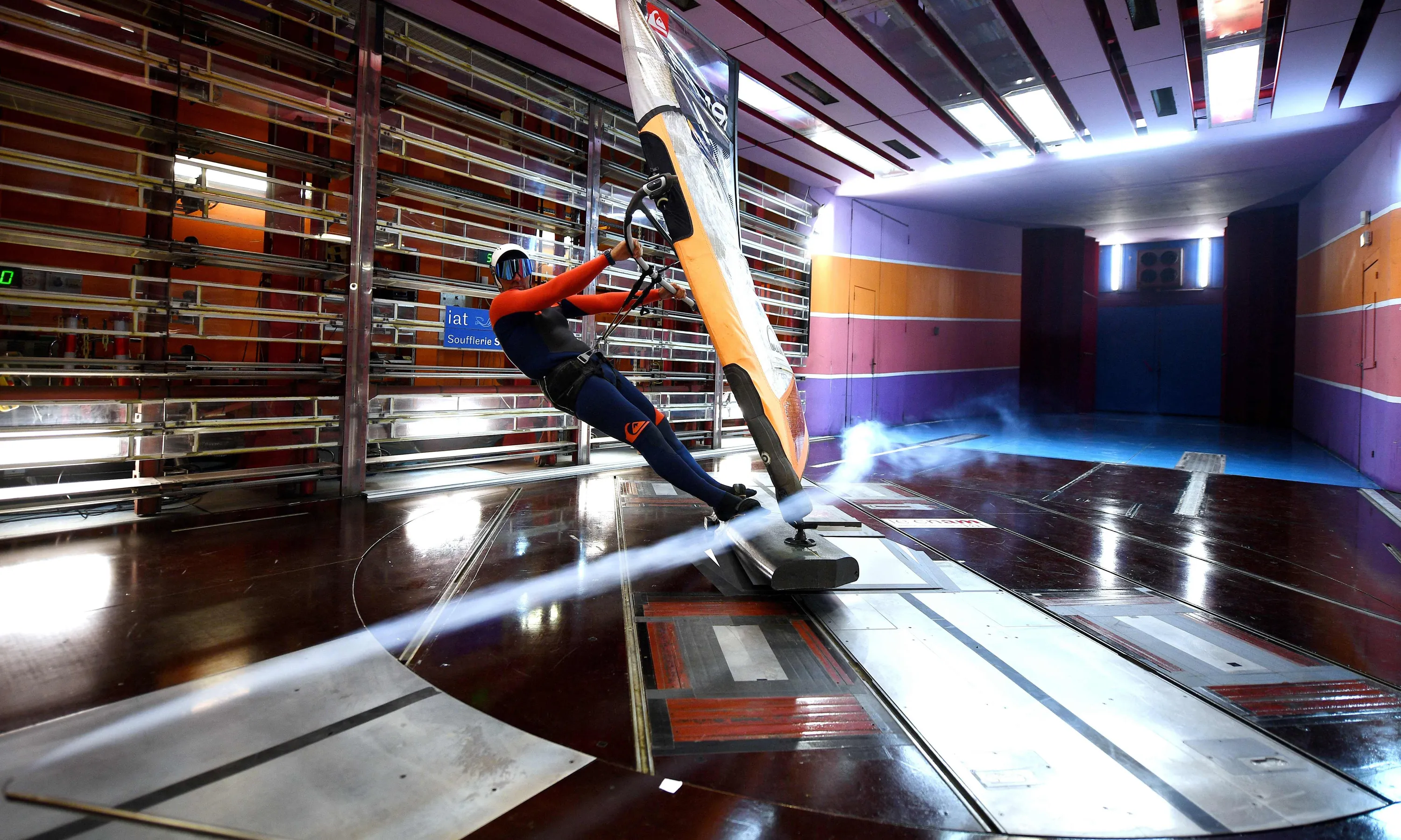 French windsurfer Antoine Albeau stands on his board as he performs tests in a wind tunnel to study aerodynamic phenomena at high speed in Saint-Cyr-l'Ecole, near Paris, on December 7, 2020. 25 times world champion Antoine Albeau's goal is to beat the world speed record in sailing by reaching 121,1 km/h in windsurfing. (Photo by Franck Fife/AFP Photo)