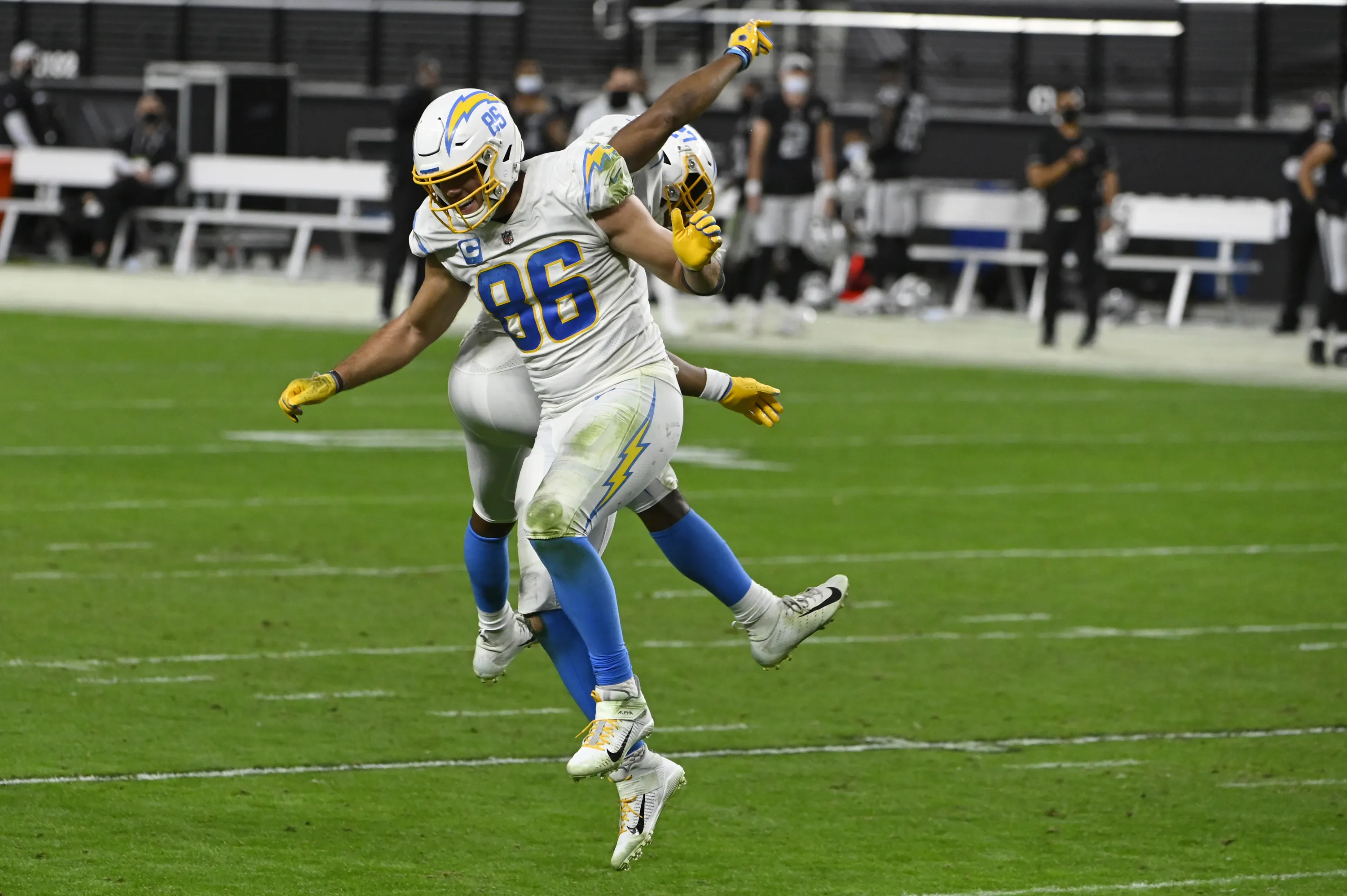 Los Angeles Chargers tight end Hunter Henry (86) and running back Joshua Kelley (27) celebrate after a teammate recovered a Los Angeles Chargers fumble in overtime of an NFL football game against the Las Vegas Raiders, Thursday, December 17, 2020, in Las Vegas. (Photo by David Becker/AP Photo)
