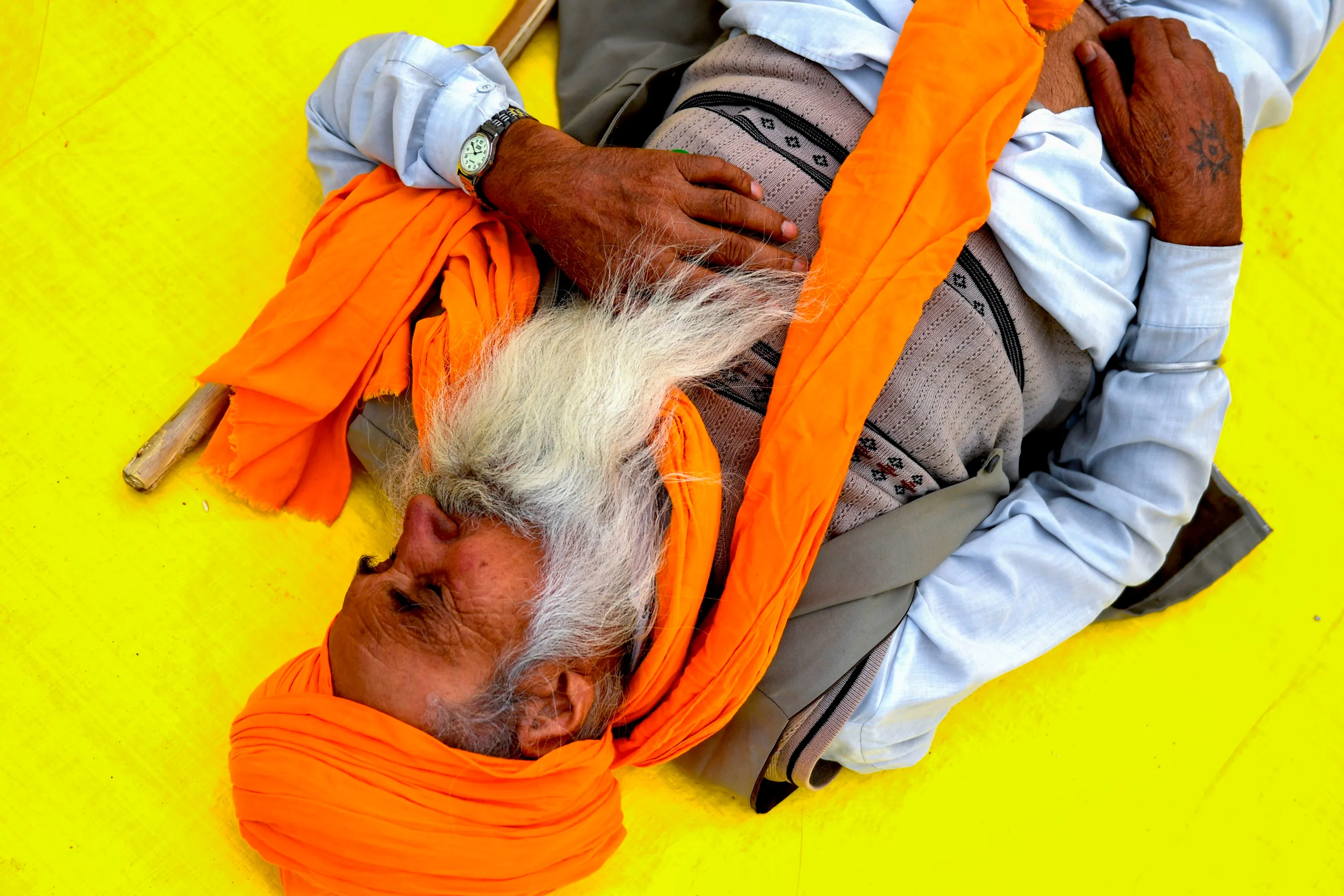 A farmer takes a nap along a blocked highway during a demonstration against the central government's recent agricultural reforms at the Delhi-Uttar Pradesh state border in Ghazipur on December 11, 2020. (Photo by Money Sharma/AFP Photo)