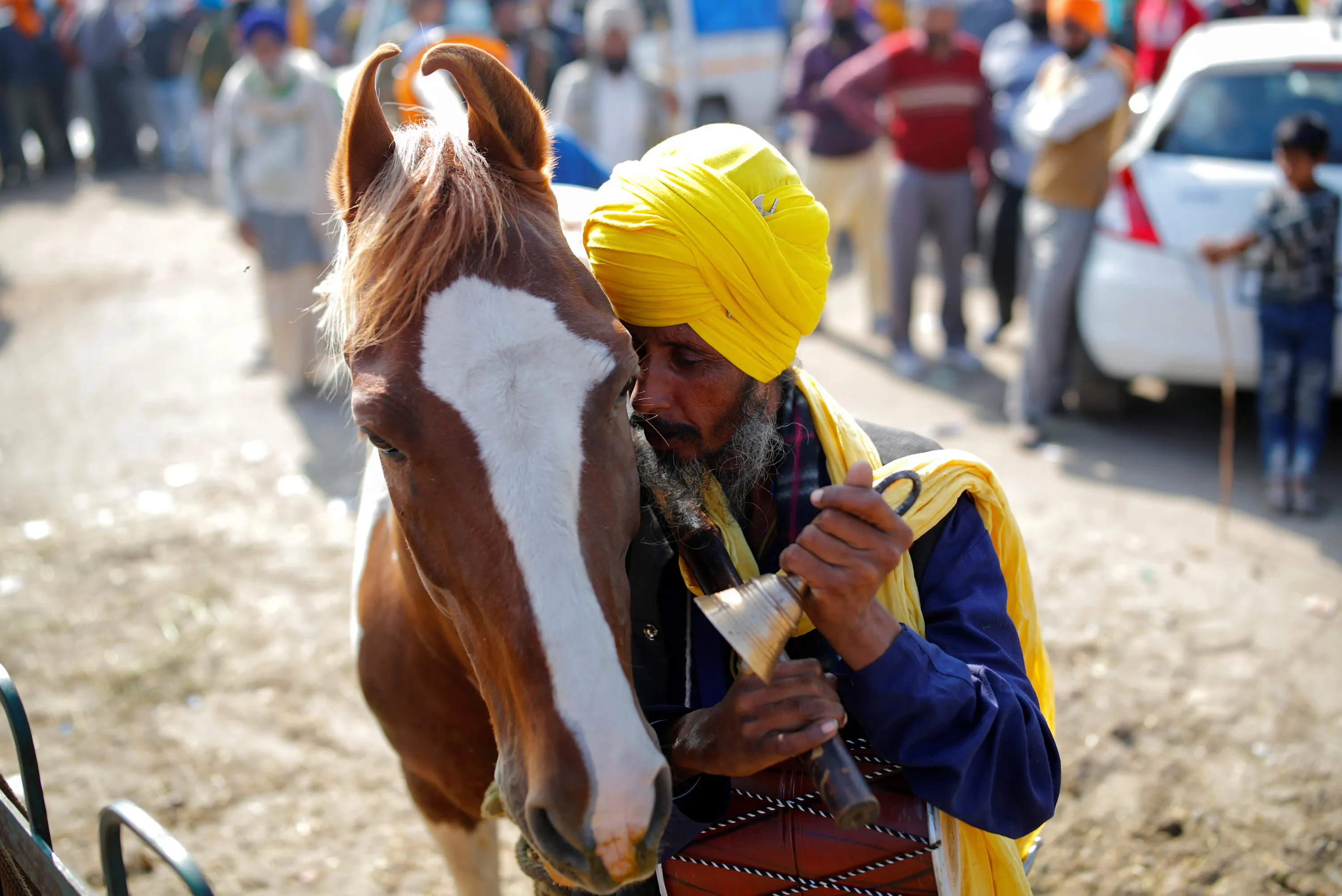 A Nihang (Sikh warrior) kisses his horse at the site of a protest against the newly passed farm bills at Singhu border near New Delhi, India, December 14, 2020. (Photo by Adnan Abidi/Reuters)