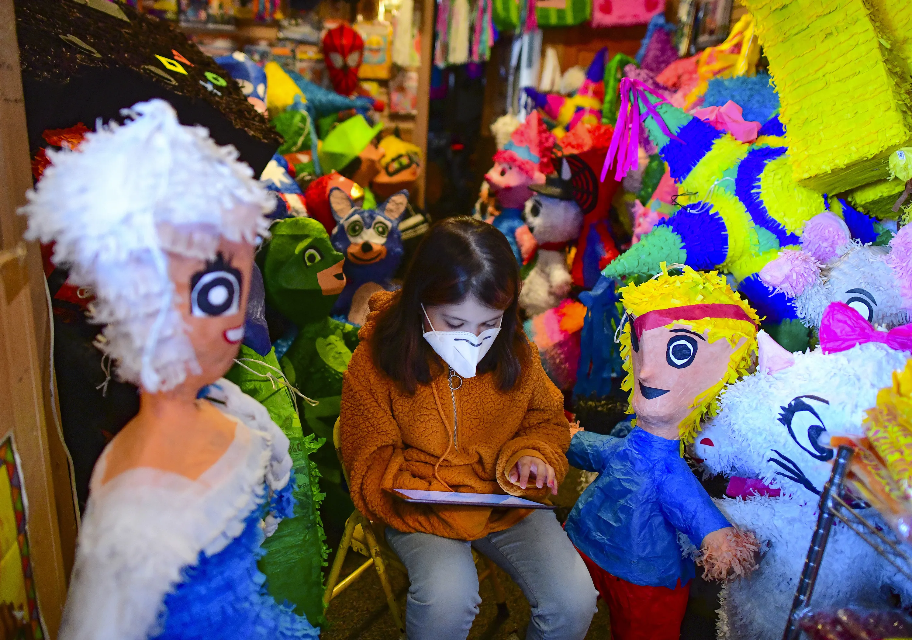 Sarita Reyes works on her school assignments on an iPad at her mother's shop, Pinata Time, on Tuesday, December 15, 2020, in San Antonio, Texas. With Fiesta canceled, children’s birthday parties called off and government officials pleading with residents to stay home during normally festive holidays, the pandemic presented a noxious brew for “piñateros” in town. (Photo by Billy Calzada/The San Antonio Express-News via AP Photo)