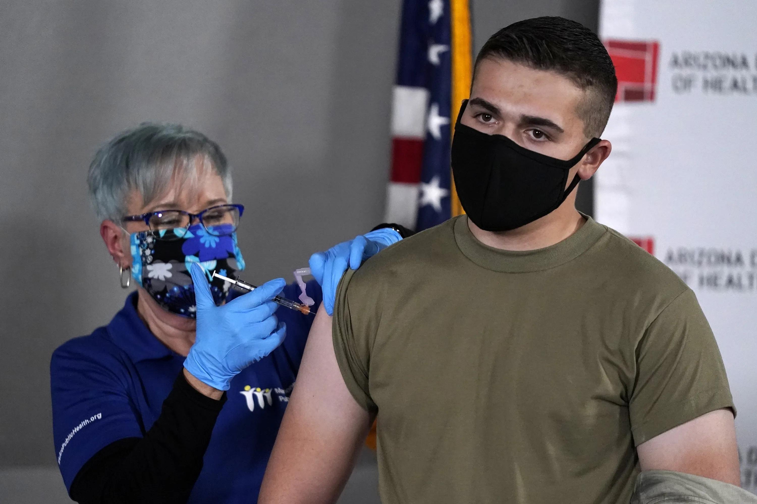 Arizona Air National Guard medic Will Smith, right, receives one of the first doses of the Pfizer-BioNTech vaccine for COVID-19 at the Arizona Department of Health Services State Laboratory from nurse Machrina Leach, Wednesday, December 16, 2020, in Phoenix. The Pfizer vaccine was almost 95 percent effective at preventing patients from contracting COVID-19 and caused no major side effects in a trial of nearly 44,000 people. (Photo by Ross D. Franklin/AP Photo)