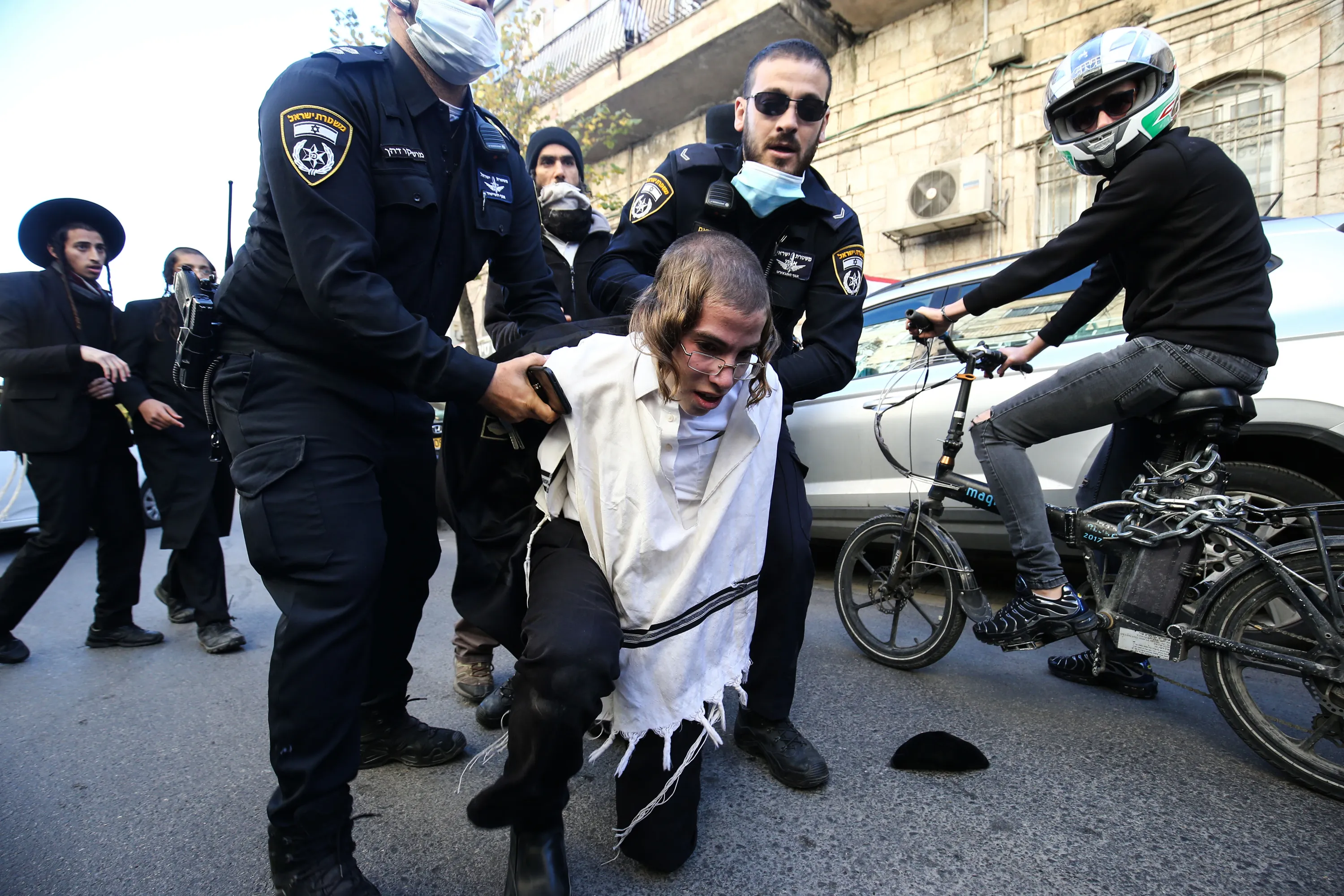 Israeli security forces take a protester into custody as anti-zionist Orthodox Jewish religious group members, known as Neturei Karta, gather to stage a protest against zionism and Israel at Mea Shearim neighborhood in Jerusalem on December 20, 2020. (Photo by Mostafa Alkharouf/Anadolu Agency via Getty Images)