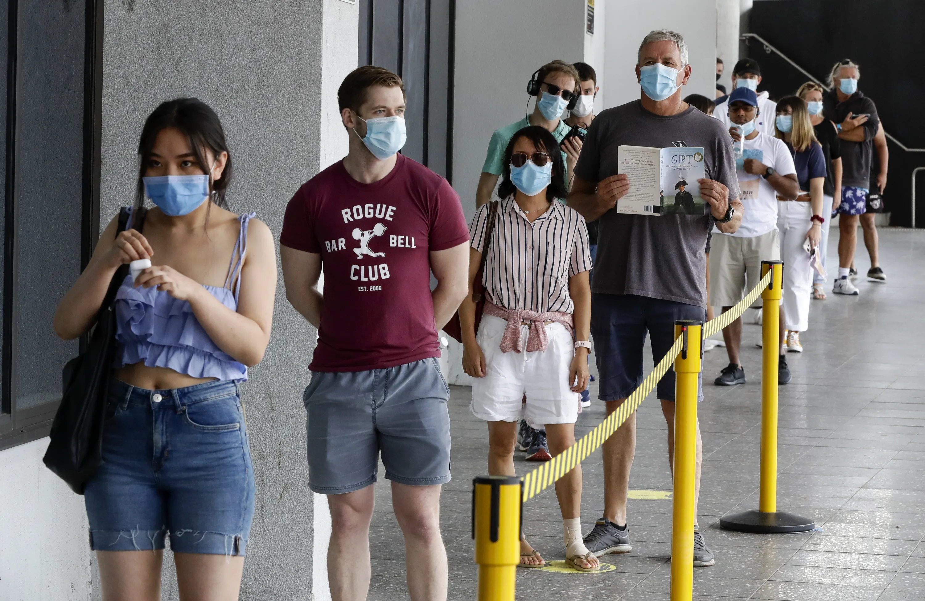 People wait in a line at a COVID-19 testing station on the northern beaches in Sydney, Australia, Monday, December 21, 2020. Sydney's northern beaches are in a lockdown similar to the one imposed during the start of the COVID-19 pandemic in March as a cluster of cases in the area increased to more than 80. (Photo by Mark Baker/AP Photo)