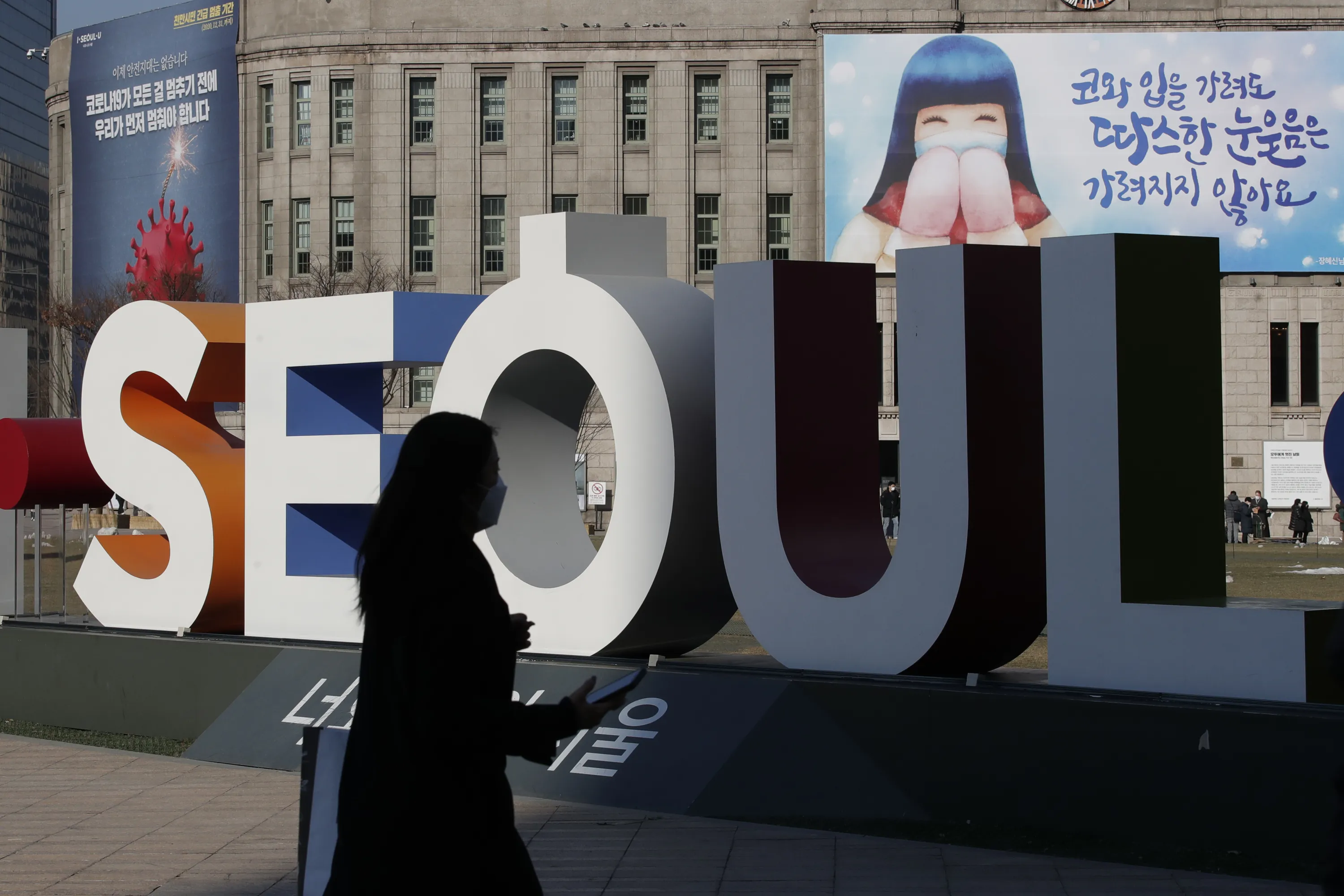 A woman wearing a face mask as a precaution against the coronavirus walks near the display of South Korea's capital Seoul logo in Seoul, South Korea, Monday, December 21, 2020. (Photo by Lee Jin-man/AP Photo)