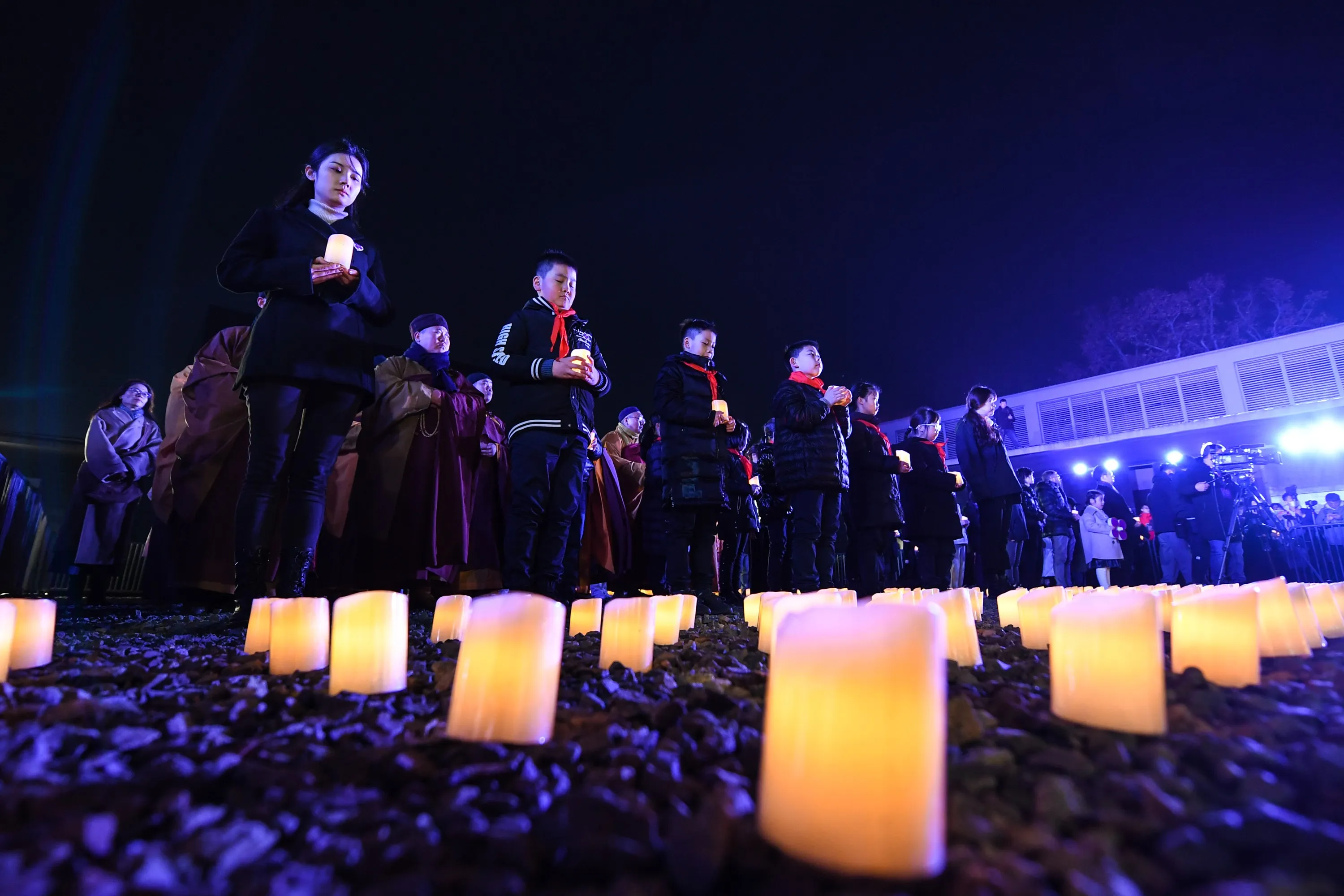 People take part in a candlelight vigil in commemoration of victims of the Nanjing Massacre on the occasion of the seventh national memorial day at the Memorial Hall of the Victims of the Nanjing Massacre by Japanese Invaders in Nanjing, capital of east China's Jiangsu Province, December 13, 2020. (Photo by Li Bo/Xinhua via Getty Images)
