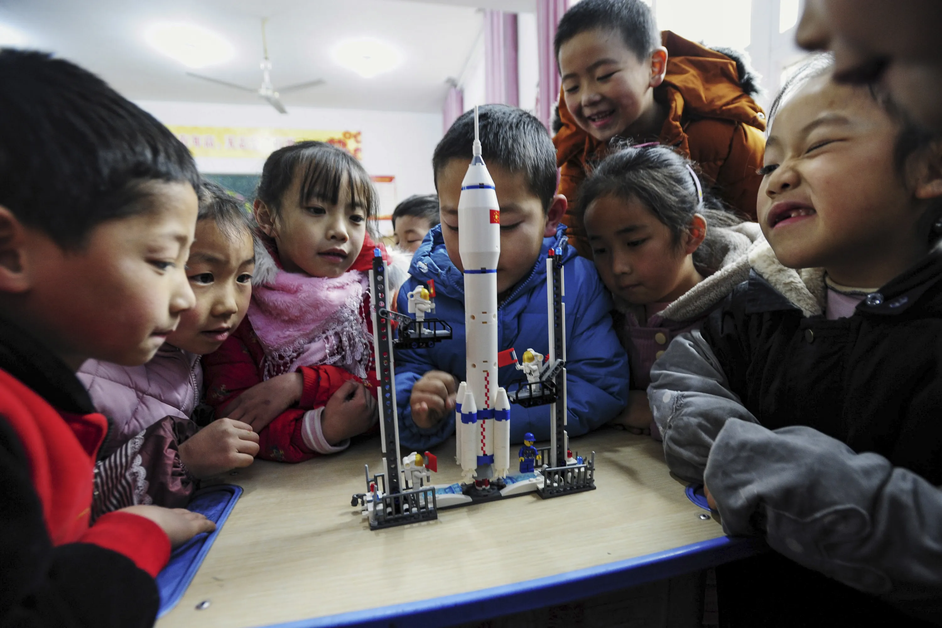 Children look at a model of the Longmarch rocket during an aerospace education lesson at a primary school in Yunyang county in southwestern China's Chongqing on December 16, 2020. (Photo by AFP Photo/China Stringer Network)