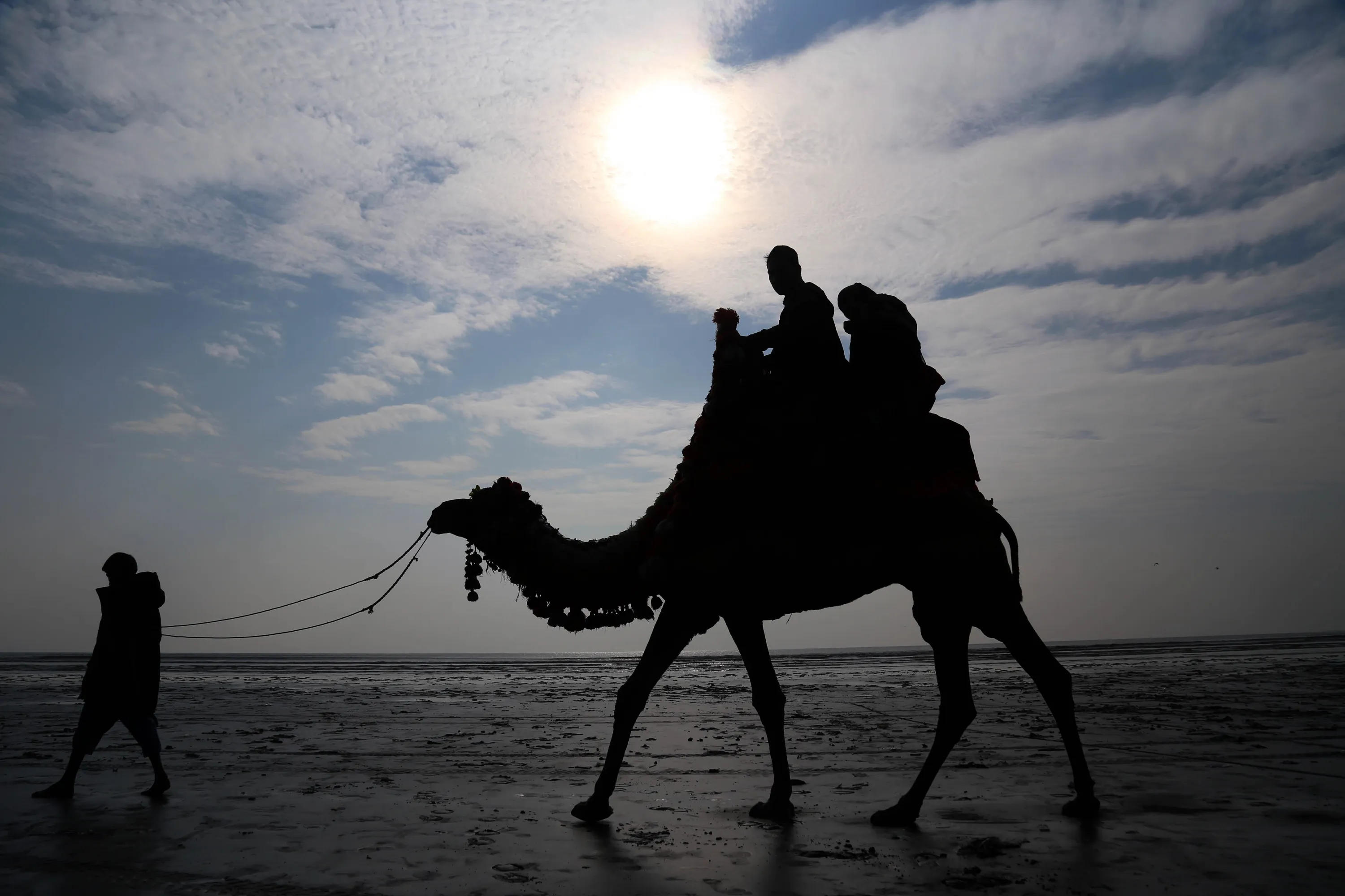 People ride a camel at a beach in Karachi, Pakistan, 25 November 2020. (Photo by Rehan Khan/EPA/EFE)