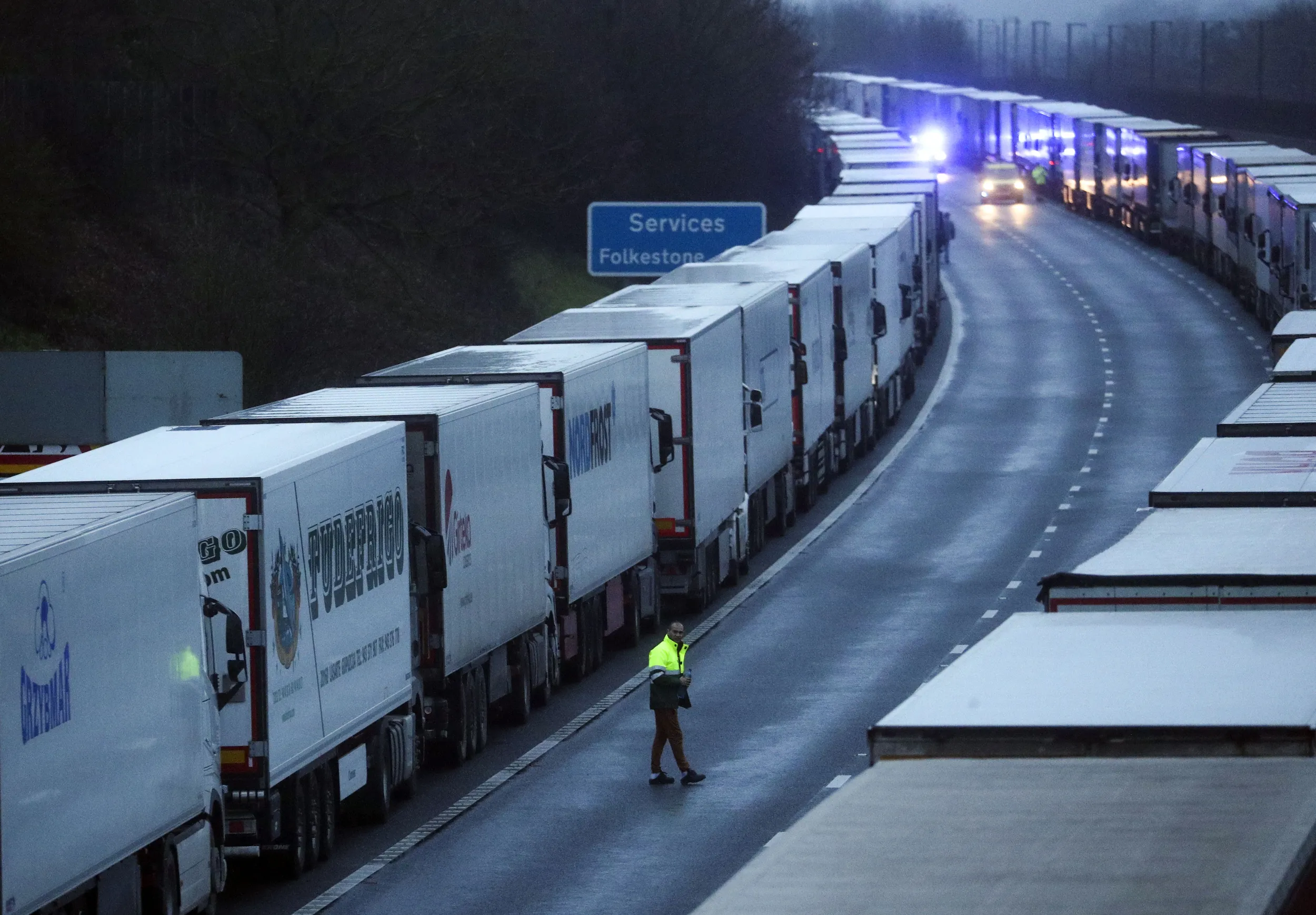 A drive sits in the cab of his lorry while parked on the M20 in Kent on December 2, 2020 after the Port of Dover was closed after the French government's announcement it will not accept any passengers arriving from the UK. France appears set to end a ban on hauliers crossing the Channel which was imposed due to fears about the spread of the new coronavirus strain. (Photo by Steve Parsons/PA Images via Getty Images)
