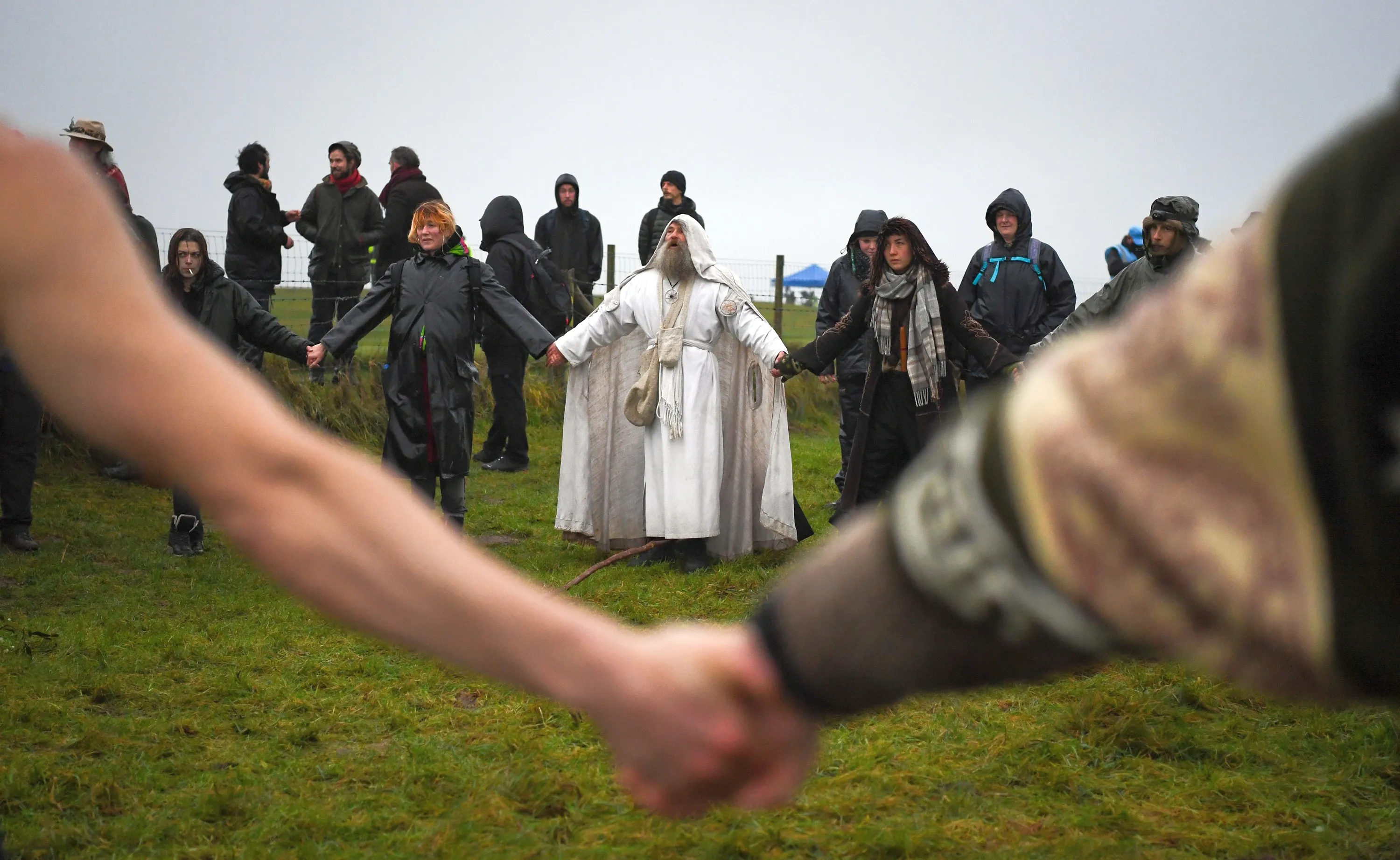 Participants take part in a ceremony at the closed Stonehenge on December 21, 2020 in Amesbury, United Kingdom. English Heritage, which manages the site, said “Owing to the pandemic, and in the interests of public health, there will be no Winter Solstice gathering at Stonehenge this year. We look forward to welcoming people back for solstice next year”. (Photo by Finnbarr Webster/Getty Images)