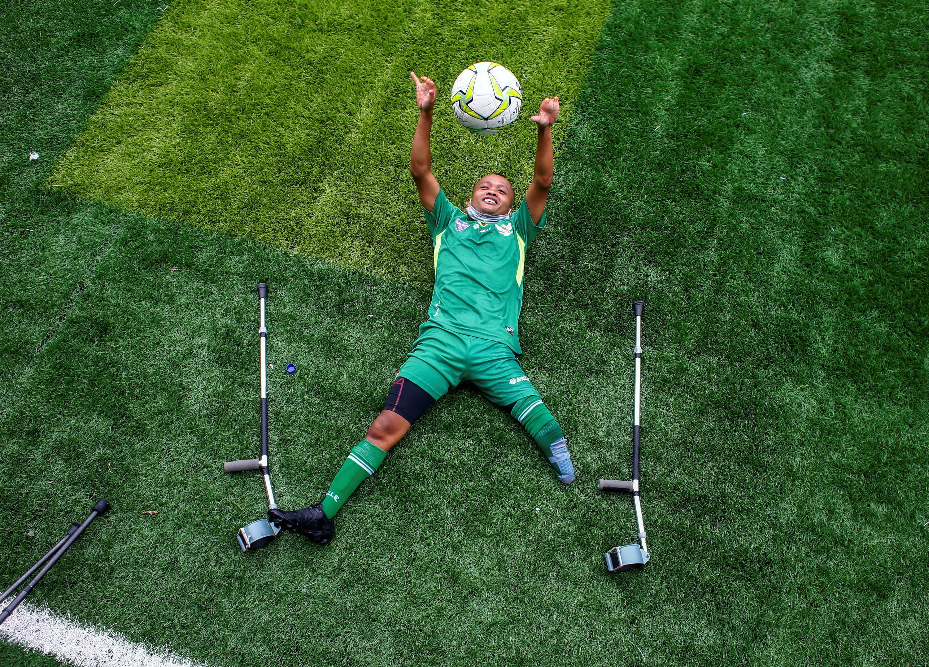 Warna Di, a 32-year-old a player from Garuda Indonesia Amputee Football (Garuda INAF), lies on the turf during the International Day of Persons with Disabilities in Jakarta, Indonesia, December 3, 2020. (Photo by Ajeng Dinar Ulfiana/Reuters)