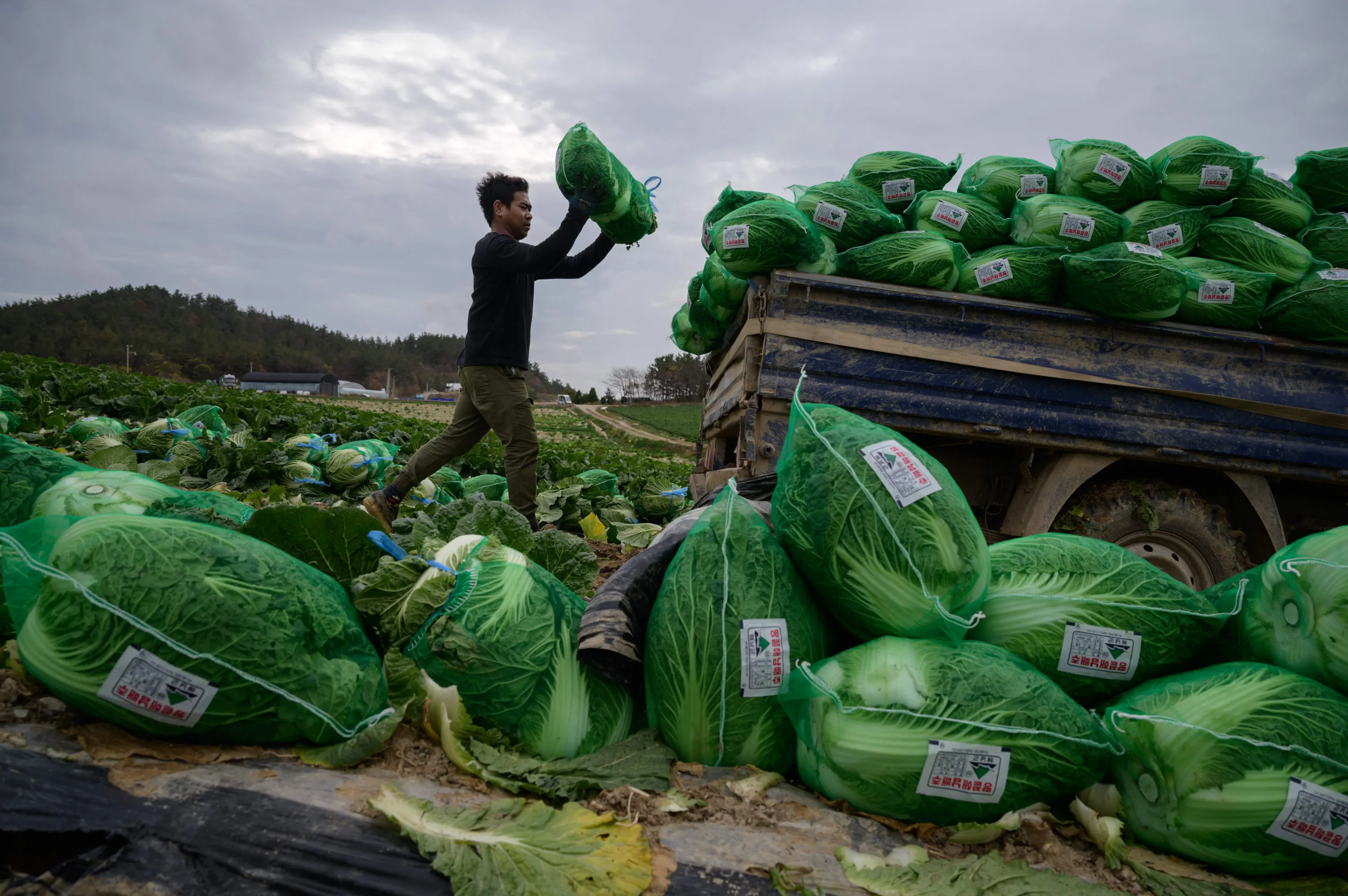 In a photo taken on November 18, 2020 a worker from Thailand loads cabbages onto a truck during a harvest at a cabbage farm near Mokpo. Originally a means of preserving the vegetable during winter, kimchi is emblematic of Korean cuisine and accompanies almost every meal served in the country, whatever its culinary origins, with kimchi-making still an important annual ritual for many families. (Photo by Ed Jones/AFP Photo)