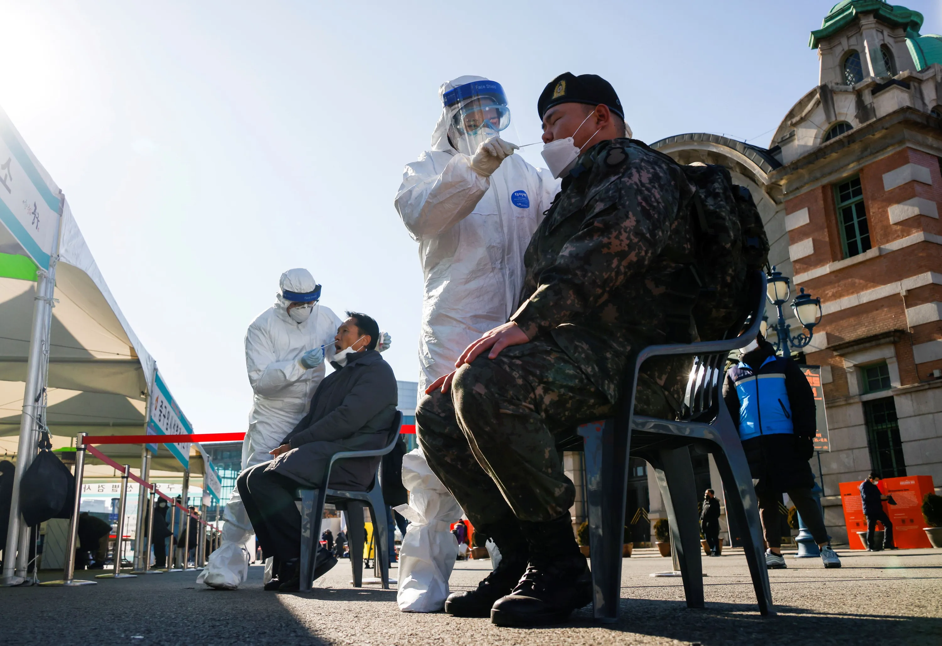 A South Korean soldier undergoes a coronavirus disease (COVID-19) test at a coronavirus testing site which is temporarily set up at a railway station in Seoul, South Korea, December 15, 2020. (Photo by Kim Hong-Ji/Reuters)
