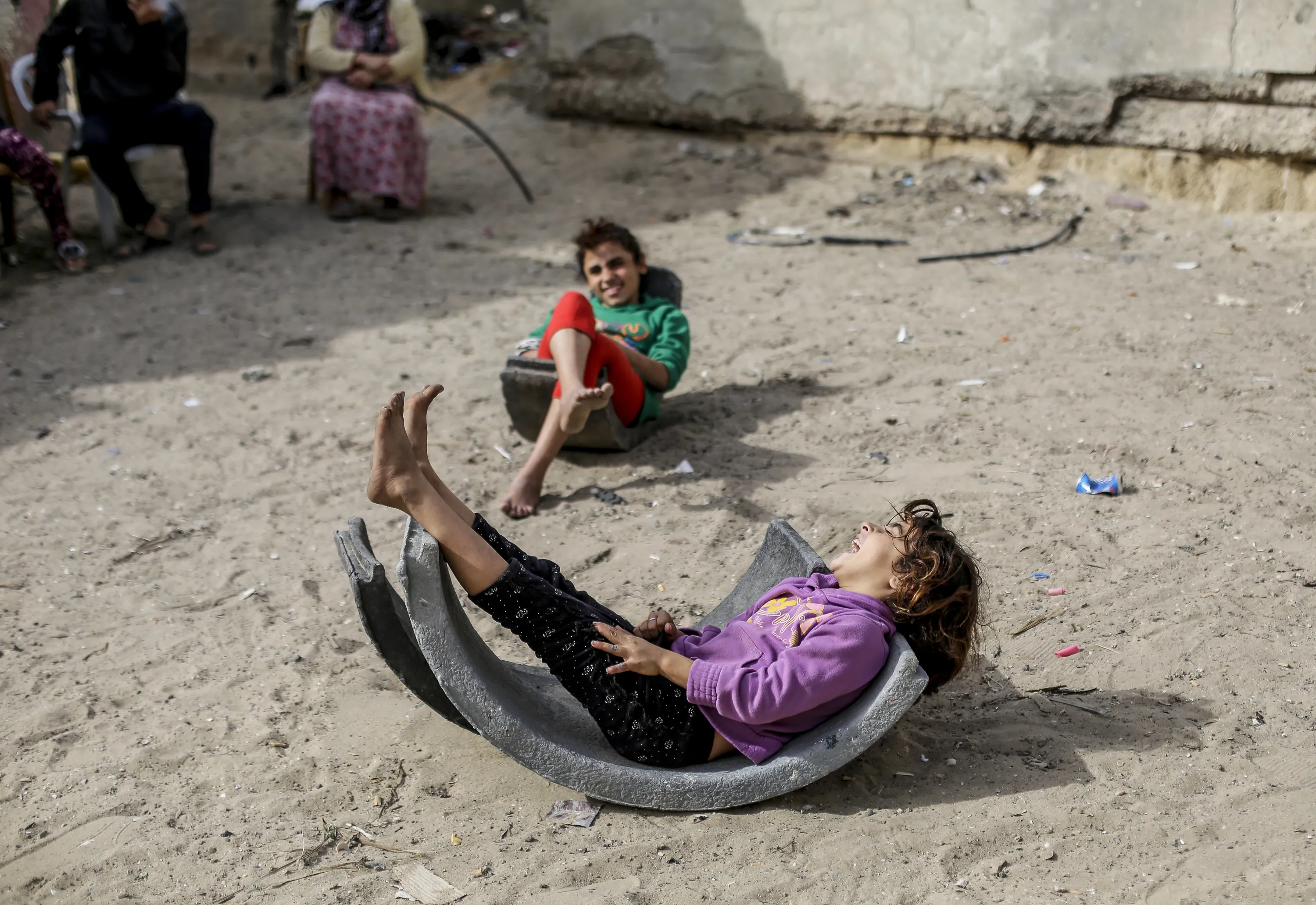 Palestinian children play outside their home in Beach camp in the western Gaza Strip on December 14, 2020. (Photo by Mahmoud Issa/SOPA Images/Rex Features/Shutterstock)