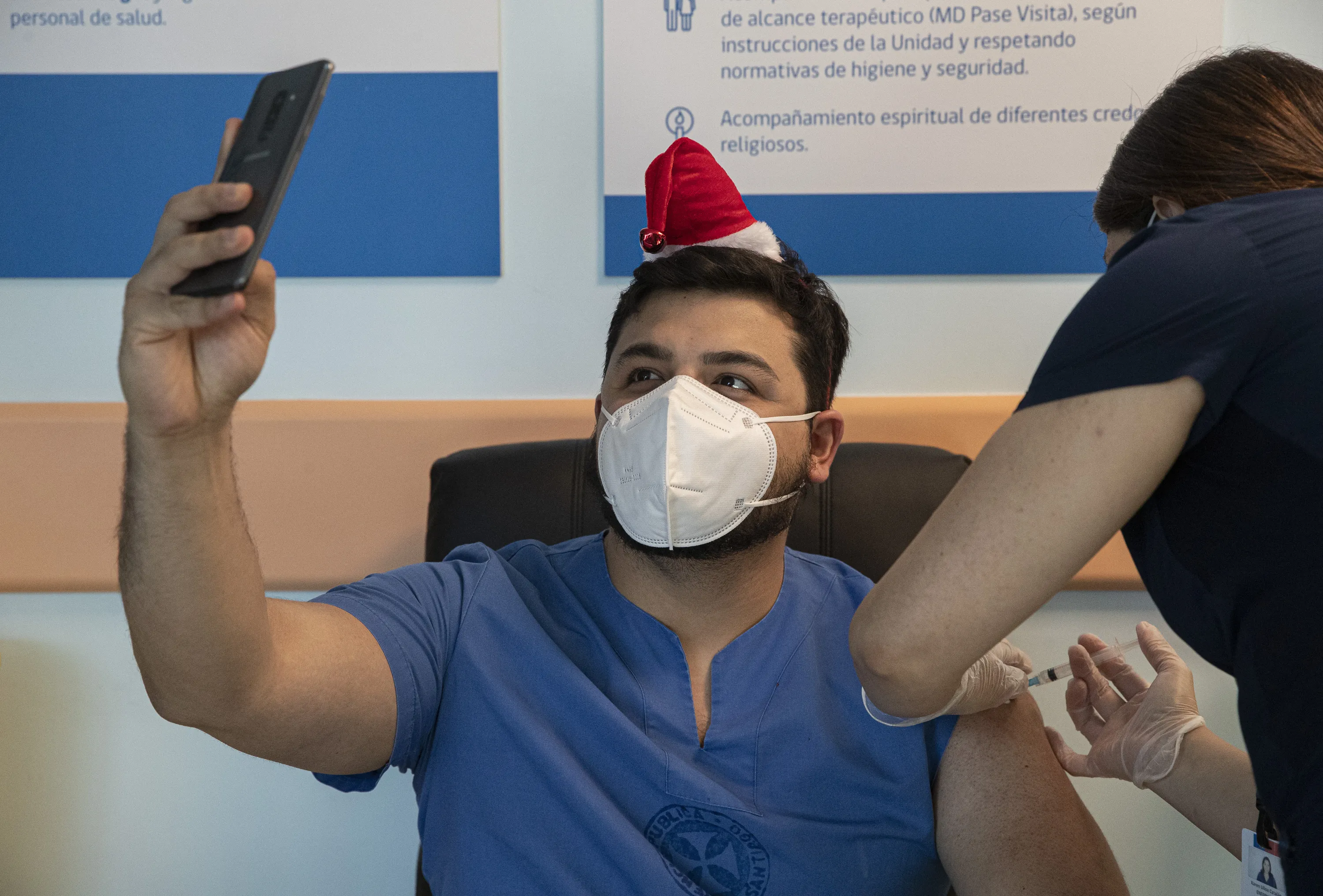 ICU Dr. German Osorio takes a selfie as he gets his COVID-19 vaccine shot at the Posta Central Hospital in Santiago, Chile, Thursday, December 24, 2020, on the same day the first shipment of vaccines arrived from Pfizer and its German partner, BioNTech. (Photo by Esteban Felix/AP Photo)