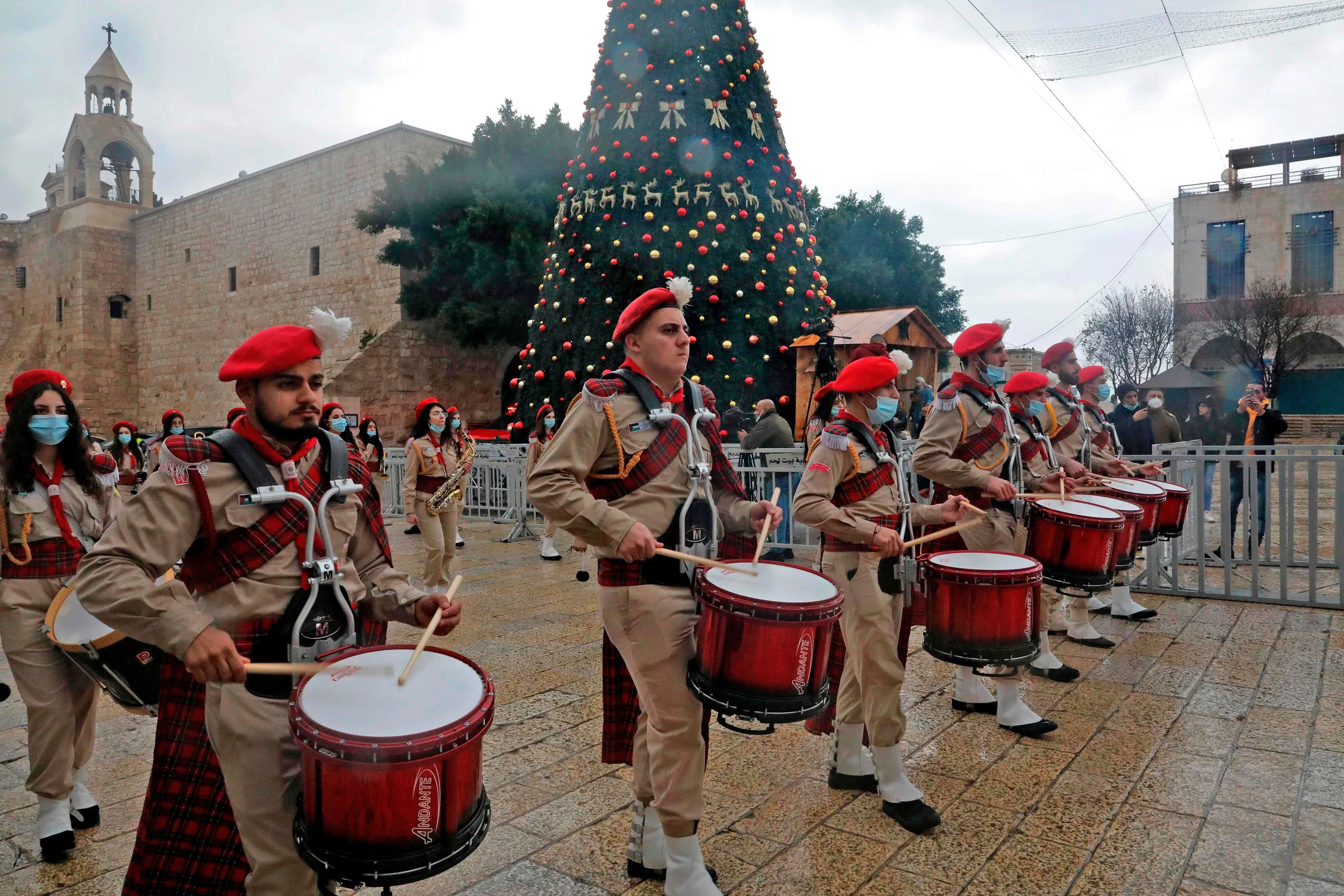 A Palestinian scouts band parades in front of the Church of the Nativity during Christmas celebrations in the biblical city of Bethlehem in the occupied West Bank, on December 24, 2020. In a normal year hundreds of thousands of visitors flood the Palestinian city in the Israeli-occupied West Bank. But with coronavirus restrictions making travel to Bethlehem all but impossible for foreign worshippers, the Church of the Nativity has been eerily calm in the days before Christmas. (Photo by Hazem Bader/AFP Photo)