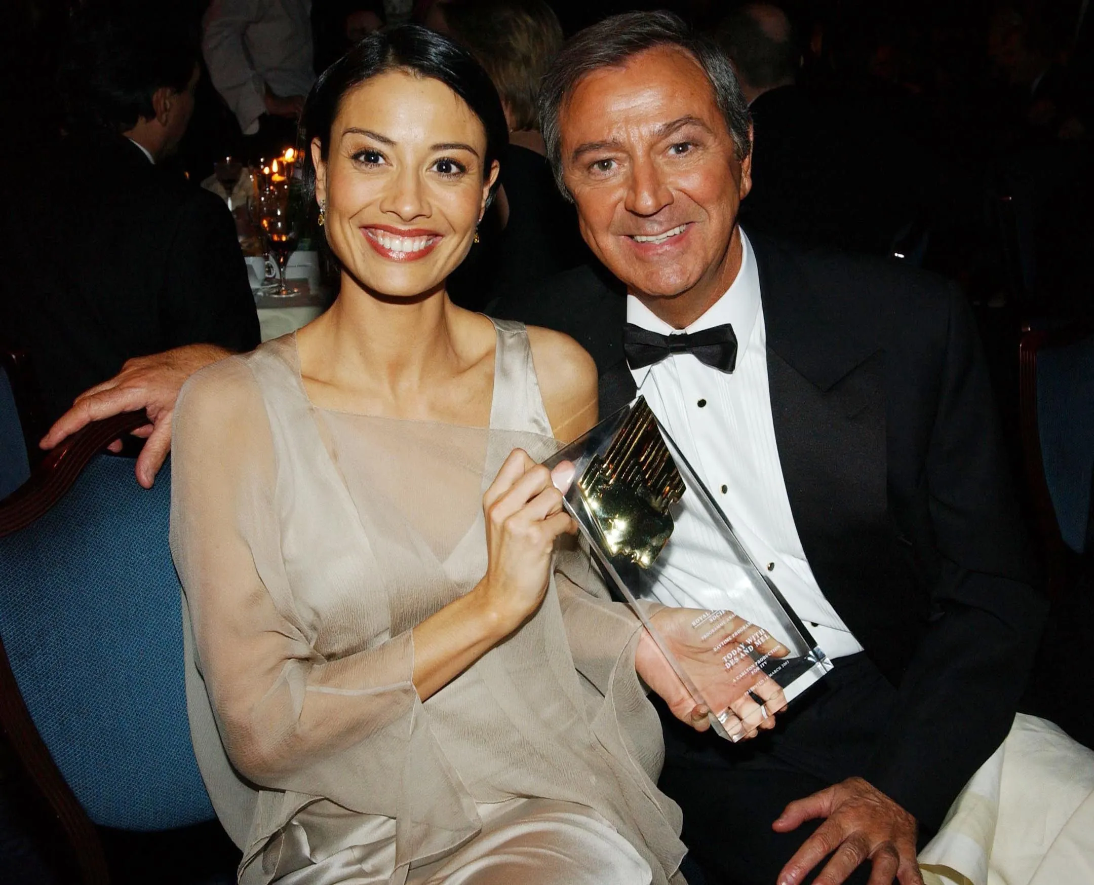 TV presenters Melanie Sykes and English comedian Des O'Connor at the Royal Television Society Programme Awards 2002 at the Grosvenor House Hotel, London on March 18, 2003. They present “Today With Des and Mel” which won an award for the best Daytime Programme. (Photo by Jon Furniss/Getty Images)