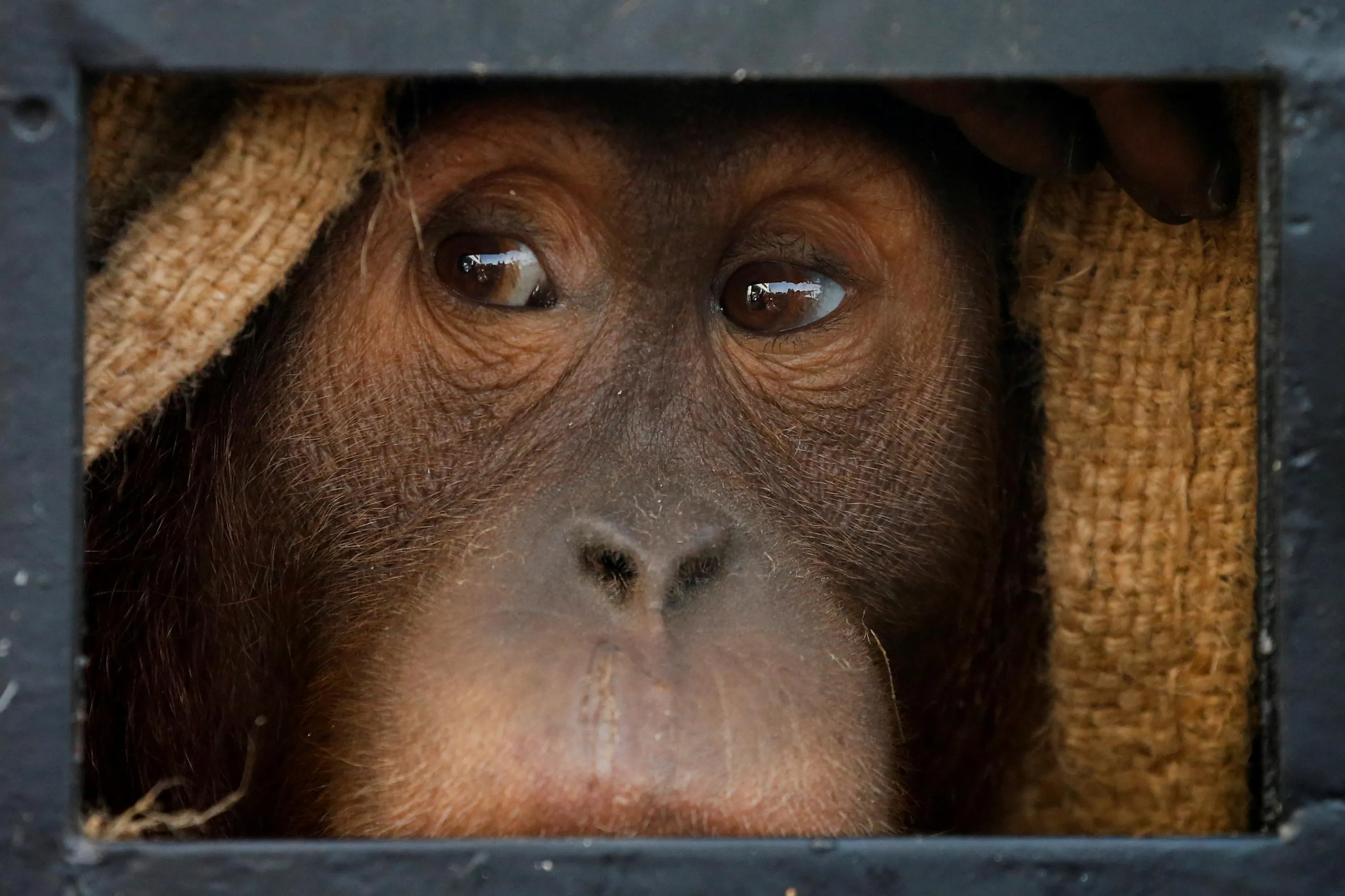 An orangutan, which was seized from the Thailand-Malaysia border 3 years ago, looks from a cage before it is being transferred to Indonesia, at the airport in Bangkok, Thailand on December 17, 2020. (Photo by Soe Zeya Tun/Reuters)