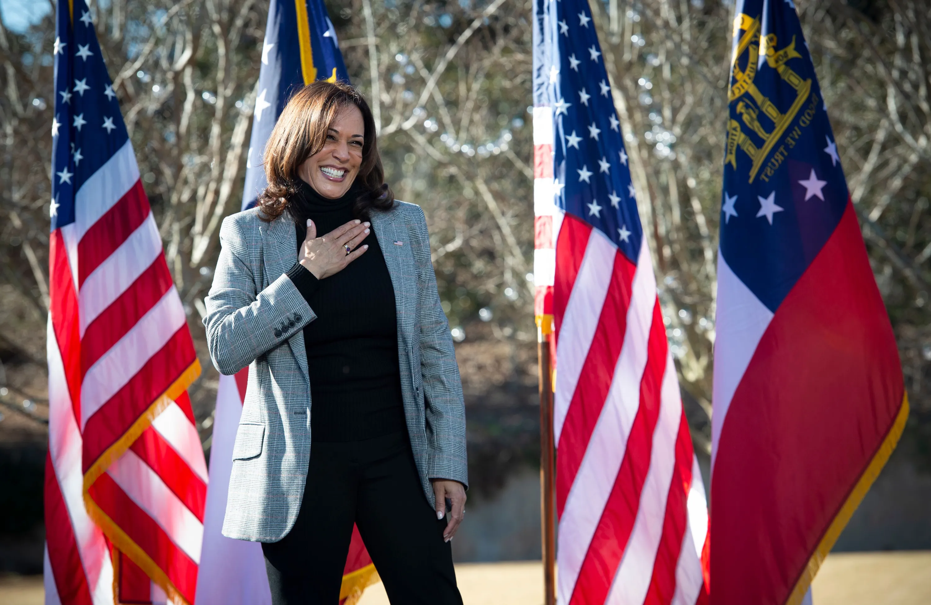 The vice president-elect, Kamala Harris, reacts to loud cheers from the crowd in Columbus on December 21, 2020 as she campaigns for Democratic Senate candidates at a drive-in rally. (Photo by Robin Rayne/ZUMA Wire/Rex Features/Shutterstock)