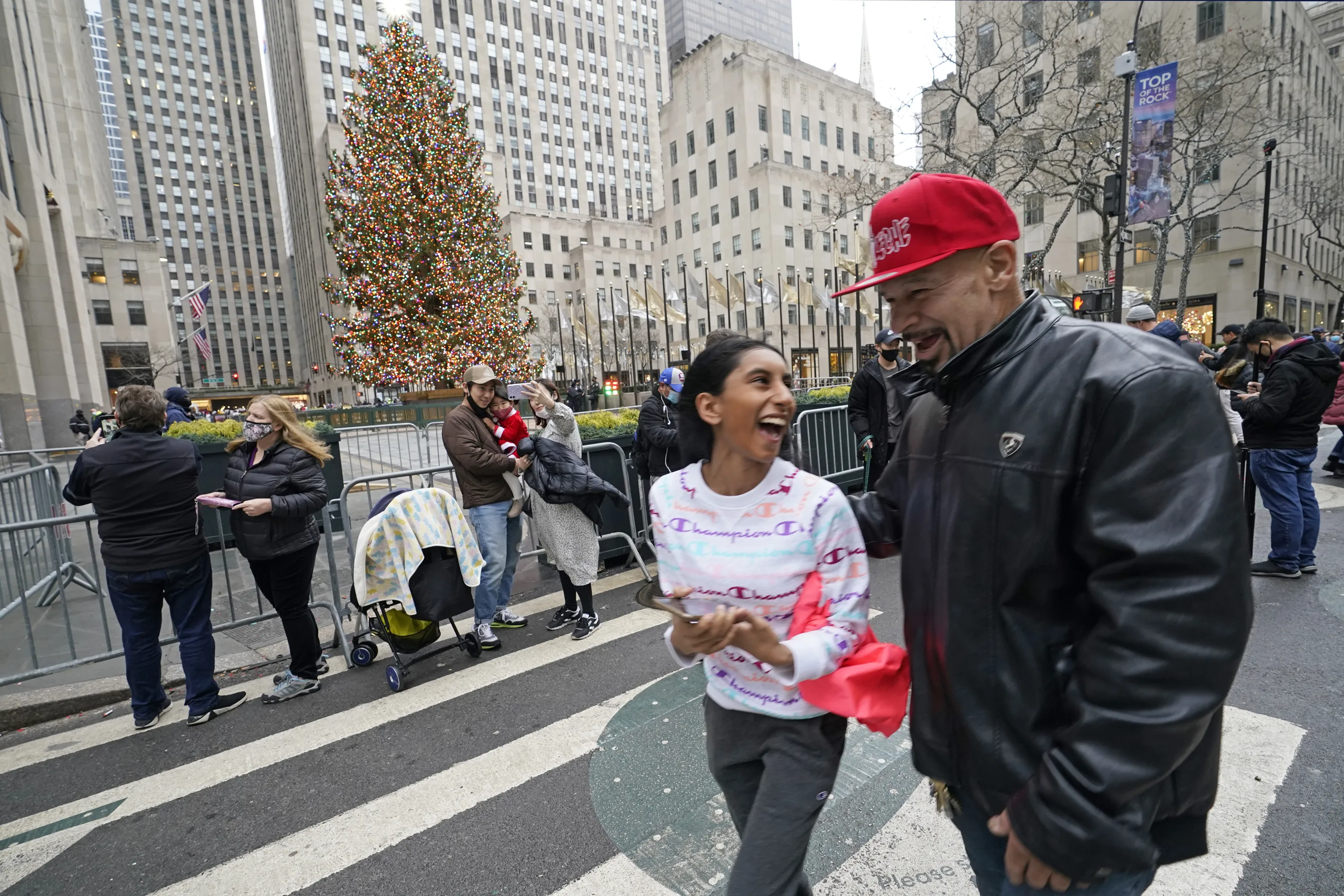 Family members laugh as they walk past by the Rockefeller Center Christmas tree, where fewer than normal people were gathered, Thursday, December 24, 2020, on Christmas Eve in New York. (Photo by Kathy Willens/AP Photo)
