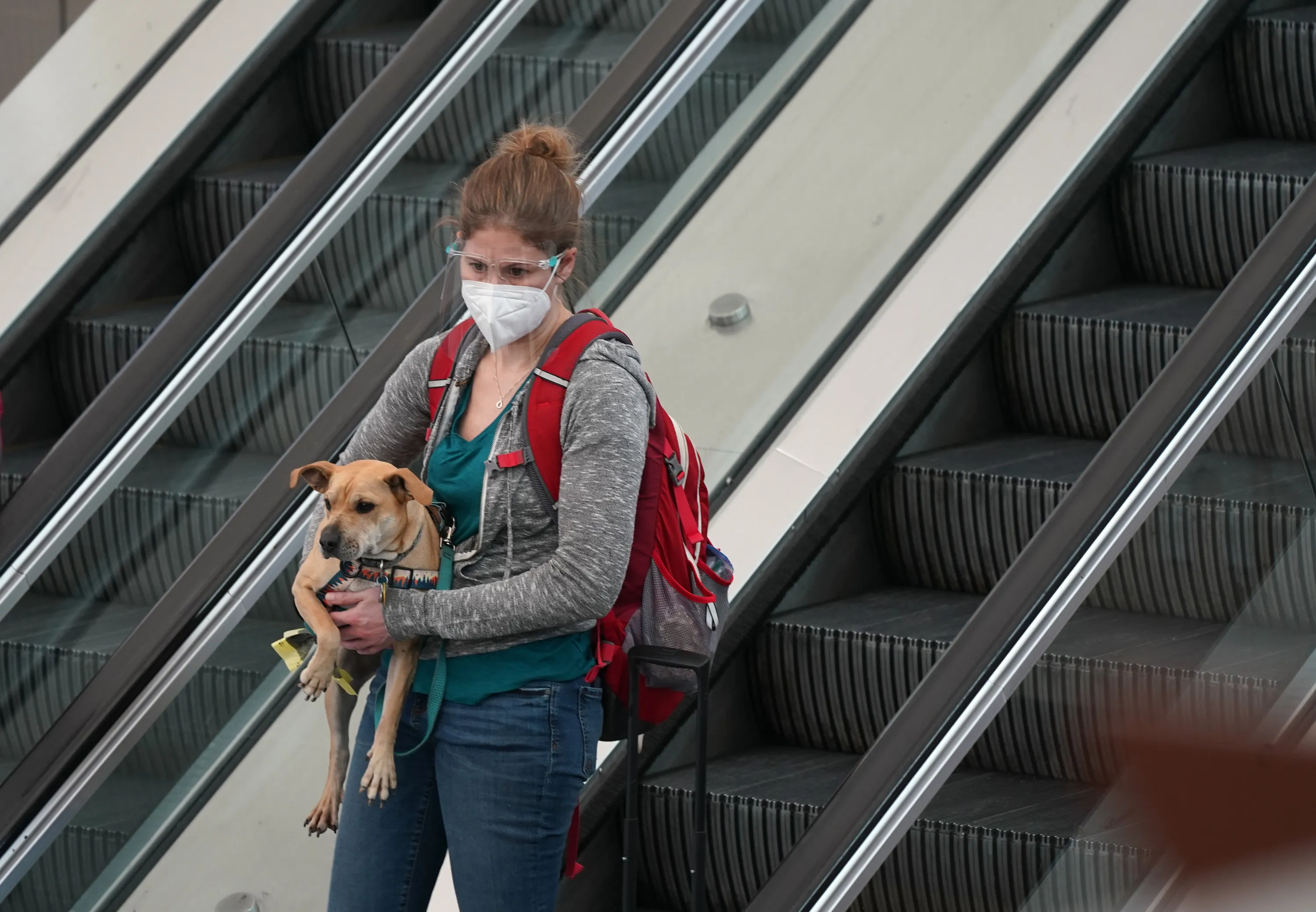 A traveller wears a face mask and a shield while carrying her dog on an escalator near the south security checkpoint in Denver International Airport Tuesday, December 22, 2020, in Denver. (Photo by David Zalubowski/AP Photo)