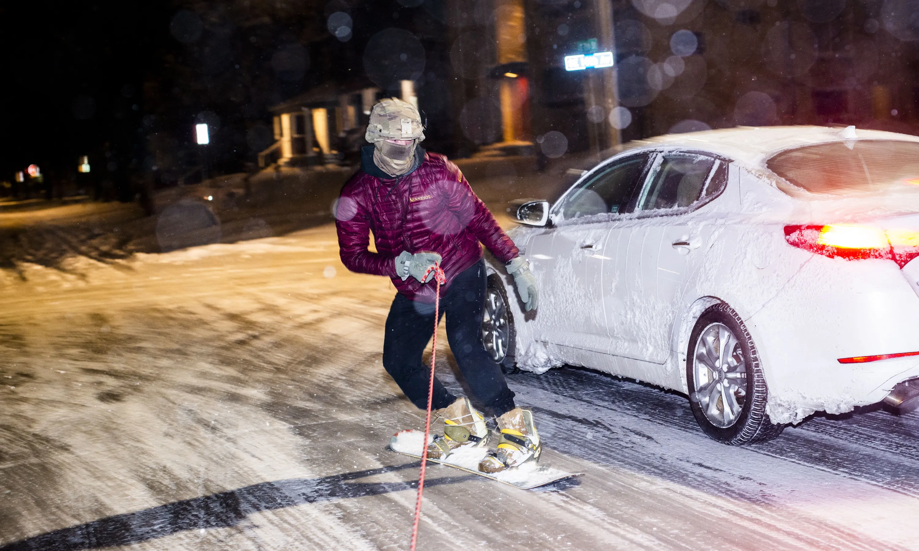 A snowboarder rides behind an SUV as snow continues to fall on December 23, 2020 in Minneapolis, Minnesota. Mid-forties temperatures this morning are giving way to high speed wind, low temperatures, and heavy snowfall, as blizzard warnings blanket the state. (Photo by Stephen Maturen/Getty Images)