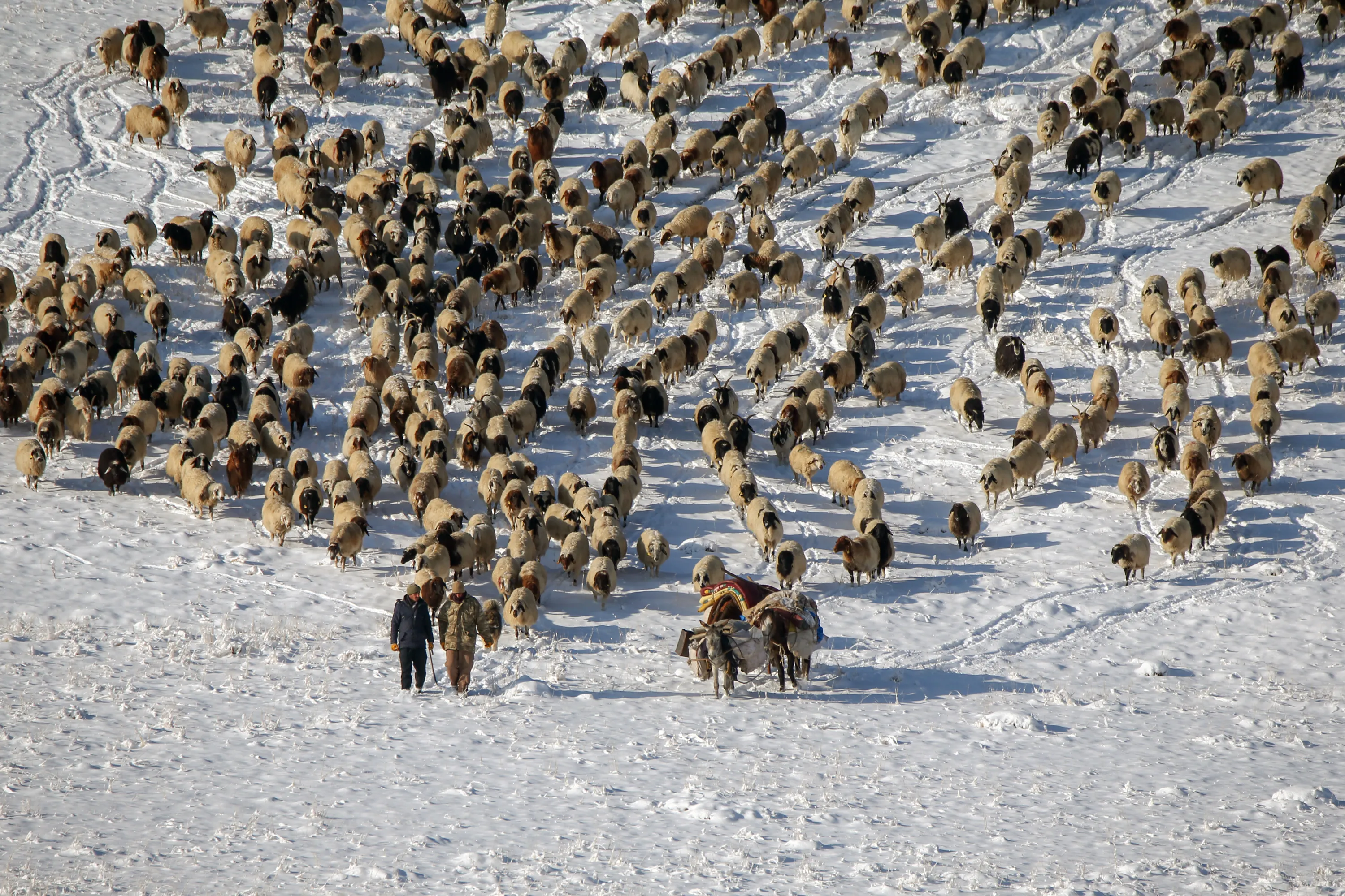 Shepherds, who set off with their herds 15 days ago, were suddenly caught by the snow and blizzard that was suppressed at the Kurubas Pass at an altitude of 2 thousand 225 meters, in Van province of Turkey on December 10, 2020. Shepherds in the Baskale distric had a hard time bringing their sheep from the highland to the city center due to the snow and blizzard. (Photo by Ozkan Bilgin/Anadolu Agency via Getty Images)