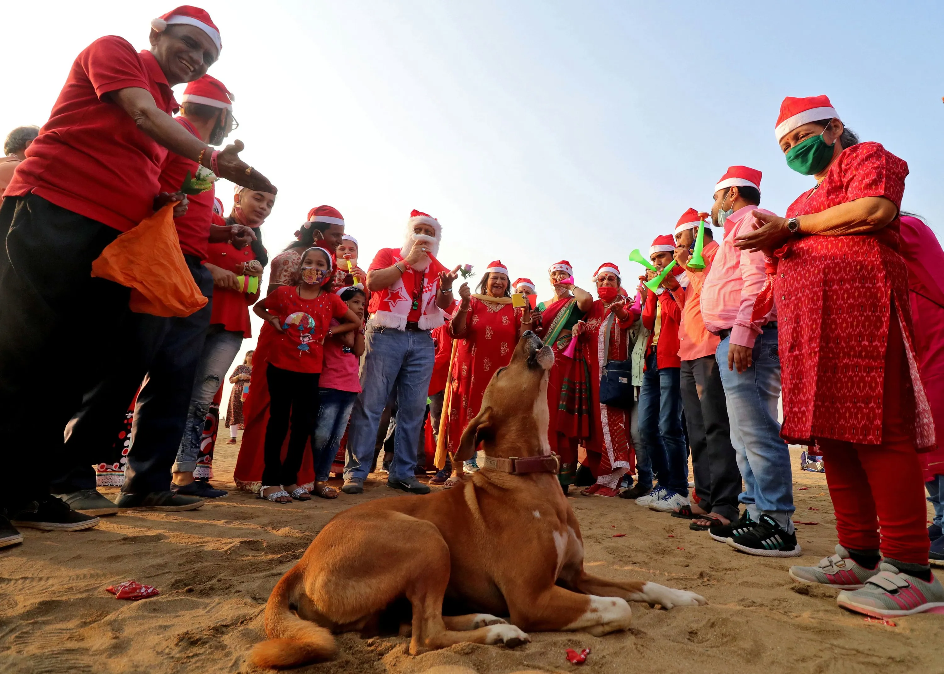 A dog howls as people wearing Santa hats take part in a laughter yoga session during Christmas celebrations on a beach in Mumbai, India, December 25, 2020. (Photo by Niharika Kulkarni/Reuters)