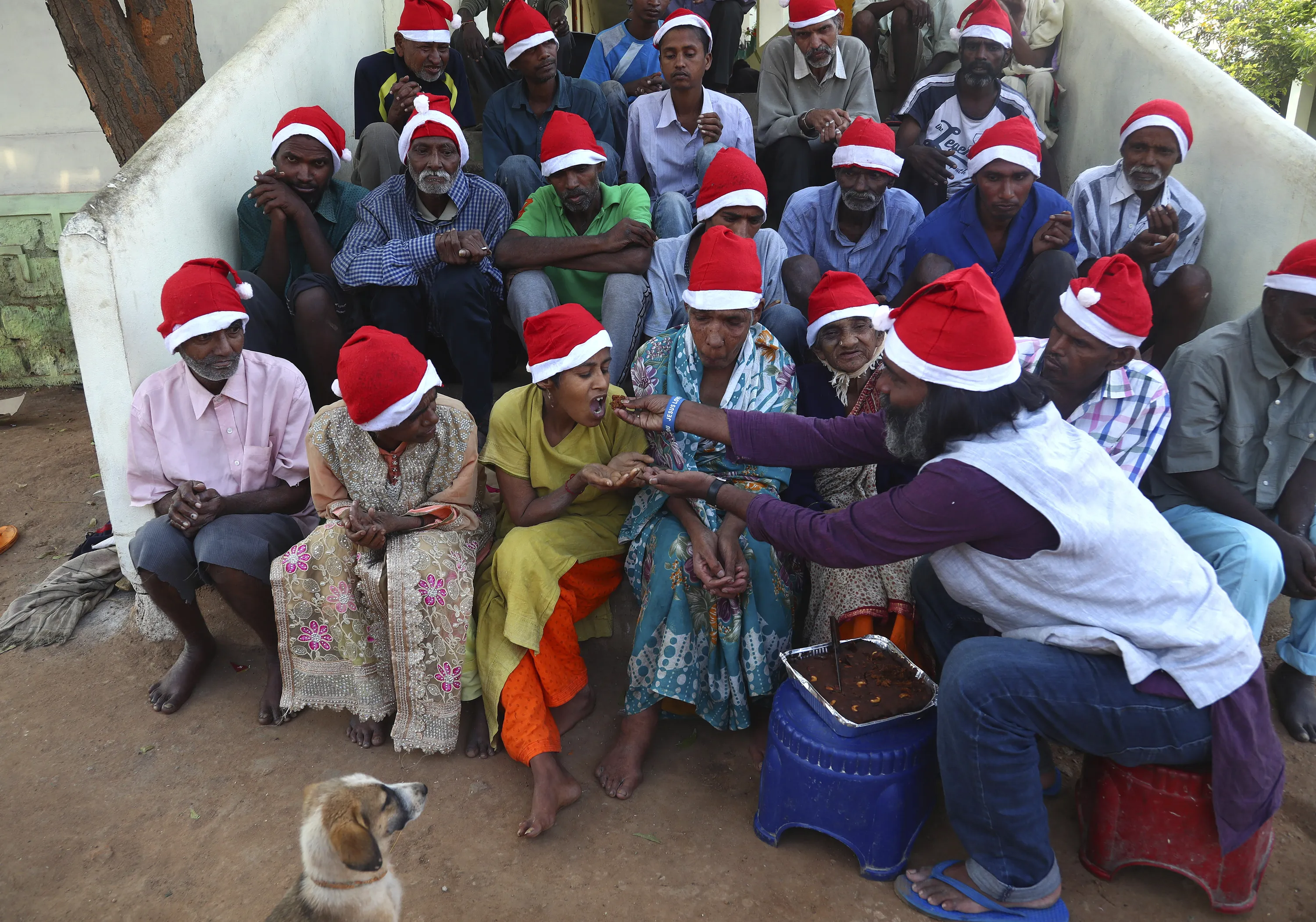 George Rakesh Babu, right, founder of Good Samaritans India, a non-government organization feeds food to a homeless person at a shelter to celebrate Christmas on the outskirts of Hyderabad, India, Friday, December 25, 2020. (Photo by Mahesh Kumar A./AP Photo)